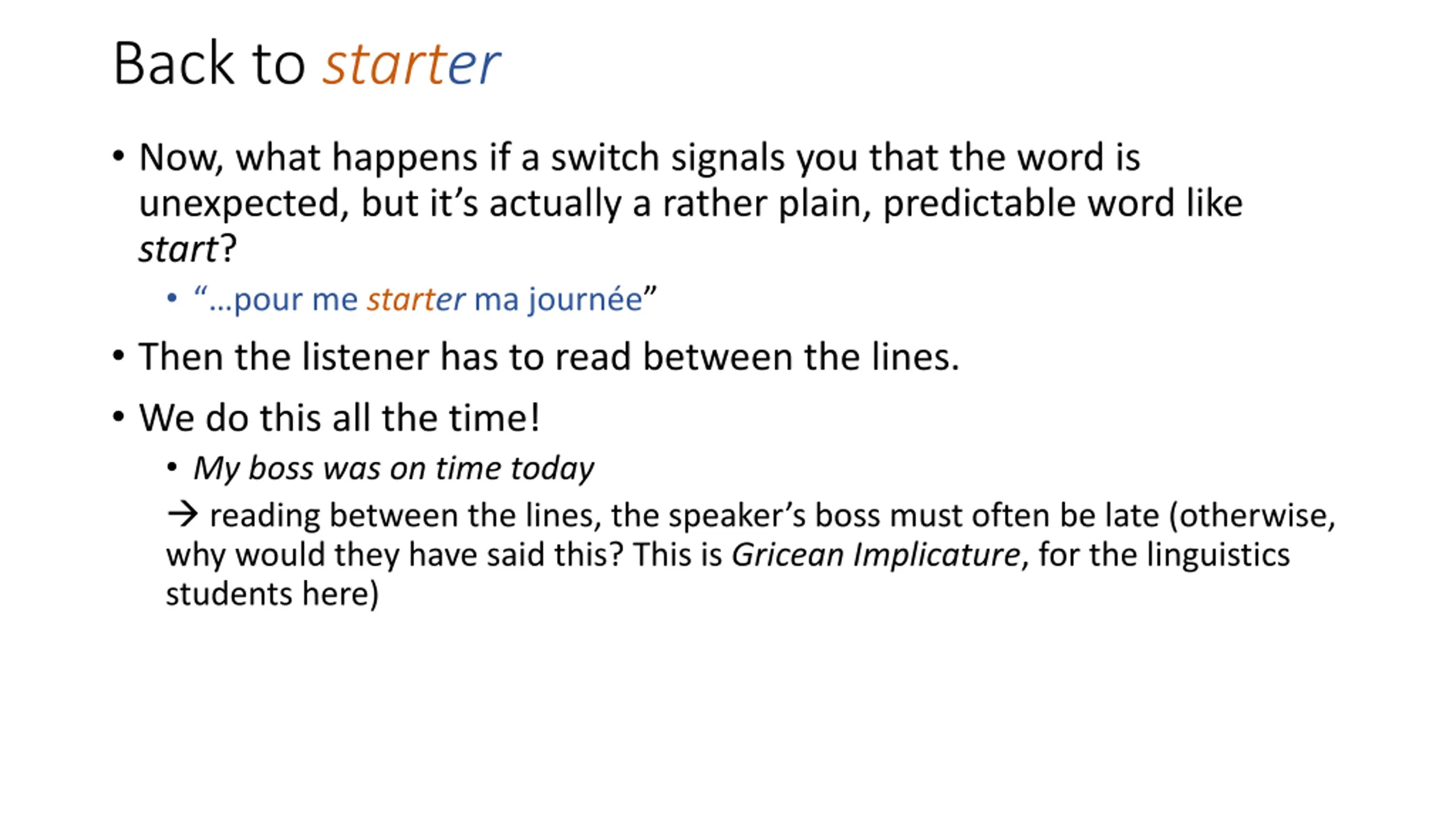 Back to starter Now, what happens if a switch signals you that the word is unexpected, but it s actually a rather plain, predictable word like start? pour me starter ma journ e Then the listener has to read between the lines. We do this all the time! My boss was on time today reading between the lines, the speaker s boss must often be late (otherwise, why would they have said this? This is Gricean Implicature, for the linguistics students here)