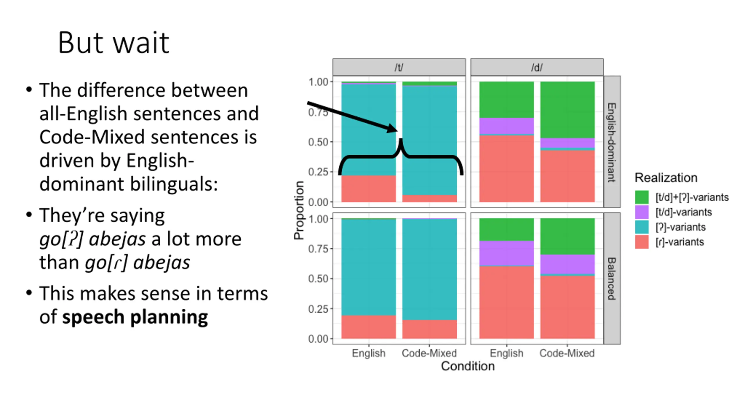But wait The difference between all-English sentences and Code-Mixed sentences is driven by English- dominant bilinguals: They re saying go[ ] abejas a lot more than go[ ] abejas This makes sense in terms of speech planning