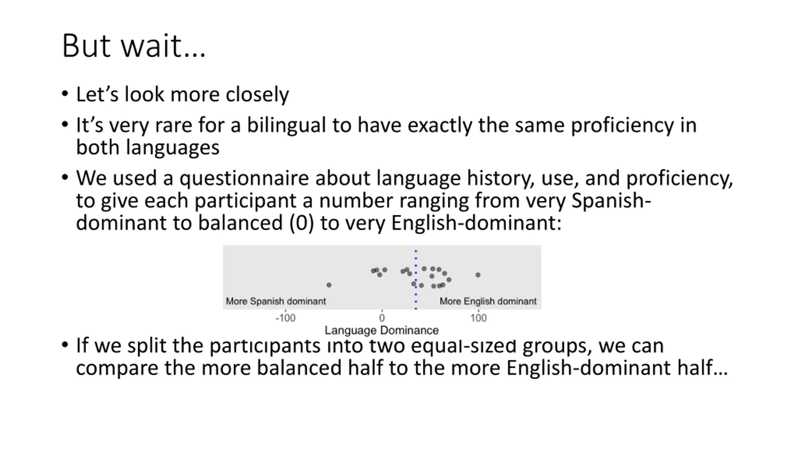 But wait Let s look more closely It s very rare for a bilingual to have exactly the same proficiency in both languages We used a questionnaire about language history, use, and proficiency, to give each participant a number ranging from very Spanish- dominant to balanced (0) to very English-dominant: If we split the participants into two equal-sized groups, we can compare the more balanced half to the more English-dominant half