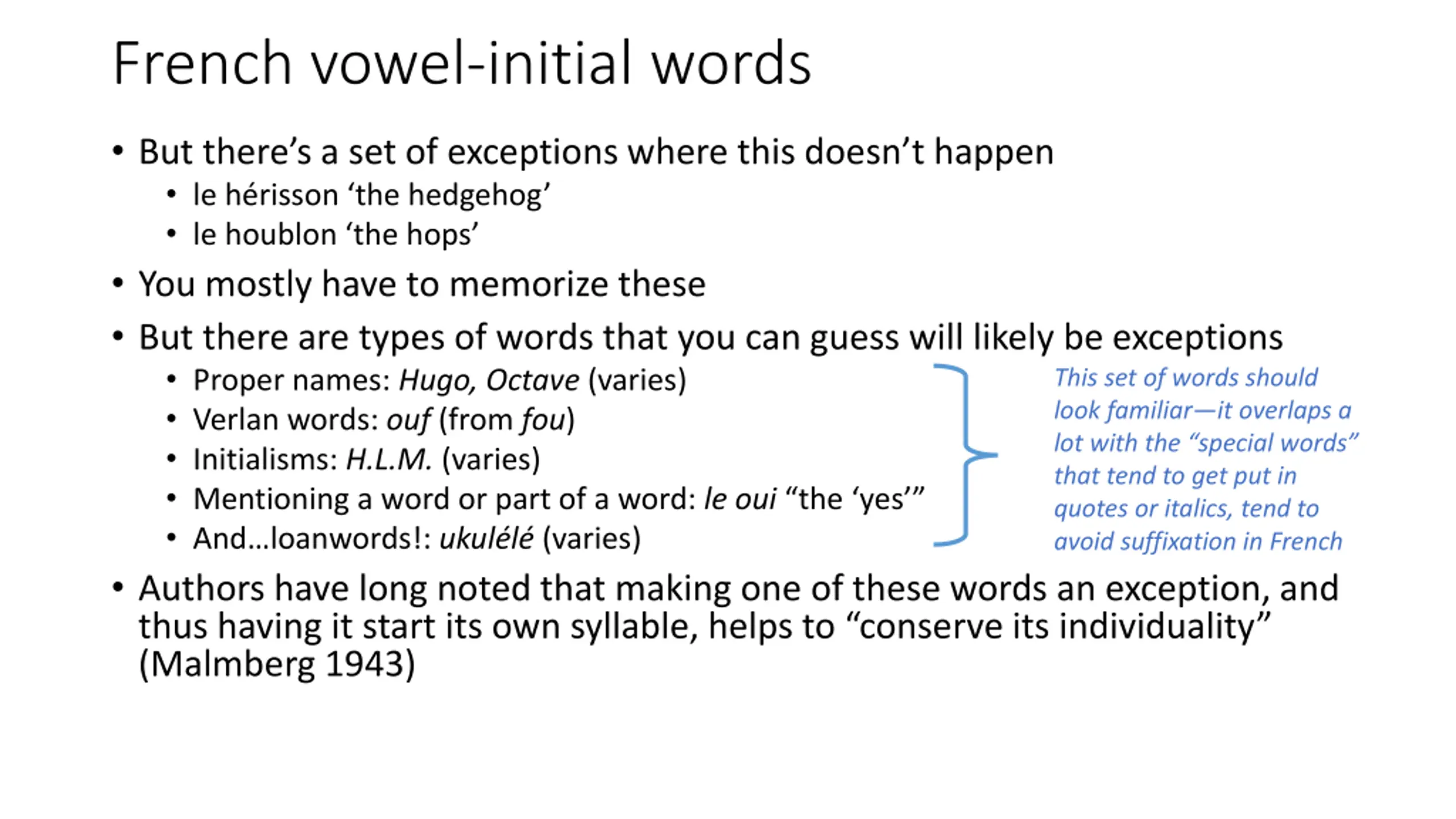 French vowel-initial words But there s a set of exceptions where this doesn t happen le h risson the hedgehog le houblon the hops You mostly have to memorize these But there are types of words that you can guess will likely be exceptions Proper names: Hugo, Octave (varies) Verlan words: ouf (from fou) Initialisms: H.L.M. (varies) Mentioning a word or part of a word: le oui the yes And loanwords!: ukul l (varies) Authors have long noted that making one of these words an exception, and thus having it start its own syllable, helps to conserve its individuality (Malmberg 1943) This set of words should look familiar it overlaps a lot with the special words that tend to get put in quotes or italics, tend to avoid suffixation in French