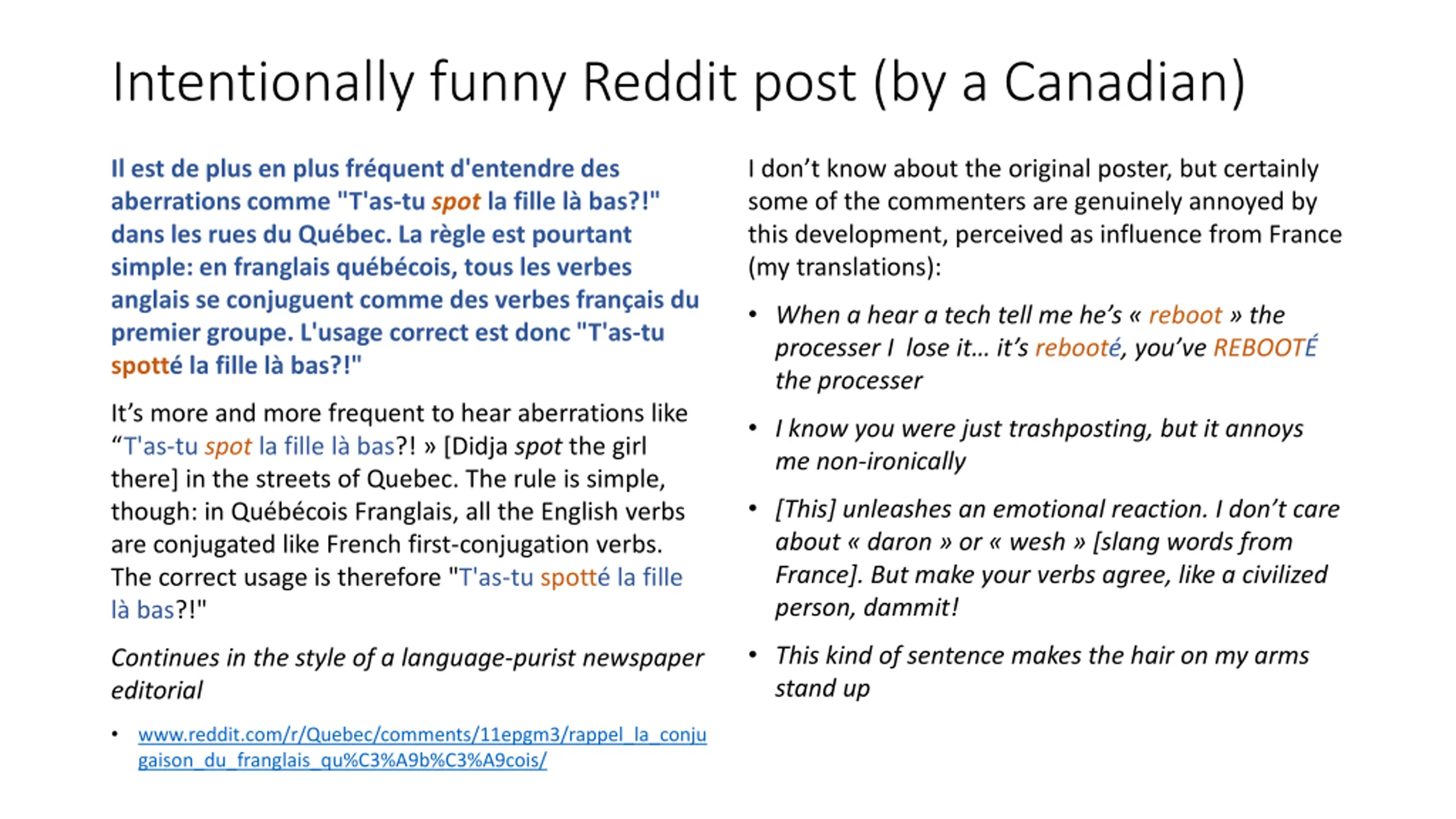Intentionally funny Reddit post (by a Canadian) Il est de plus en plus fr quent d'entendre des aberrations comme "T'as-tu spot la fille l bas?!" dans les rues du Qu bec. La r gle est pourtant simple: en franglais qu b cois, tous les verbes anglais se conjuguent comme des verbes fran ais du premier groupe. L'usage correct est donc "T'as-tu spott la fille l bas?!" I don t know about the original poster, but certainly some of the commenters are genuinely annoyed by this development, perceived as influence from France (my translations): When a hear a tech tell me he s reboot the processer I lose it it s reboot , you ve REBOOT the processer It s more and more frequent to hear aberrations like T'as-tu spot la fille l bas?! [Didja spot the girl there] in the streets of Quebec. The rule is simple, though: in Qu b cois Franglais, all the English verbs are conjugated like French first-conjugation verbs. The correct usage is therefore "T'as-tu spott la fille l bas?!" I know you were just trashposting, but it annoys me non-ironically [This] unleashes an emotional reaction. I don t care about daron or wesh [slang words from France]. But make your verbs agree, like a civilized person, dammit! This kind of sentence makes the hair on my arms stand up Continues in the style of a language-purist newspaper editorial www.reddit.com/r/Quebec/comments/11epgm3/rappel_la_conju gaison_du_franglais_qu%C3%A9b%C3%A9cois/