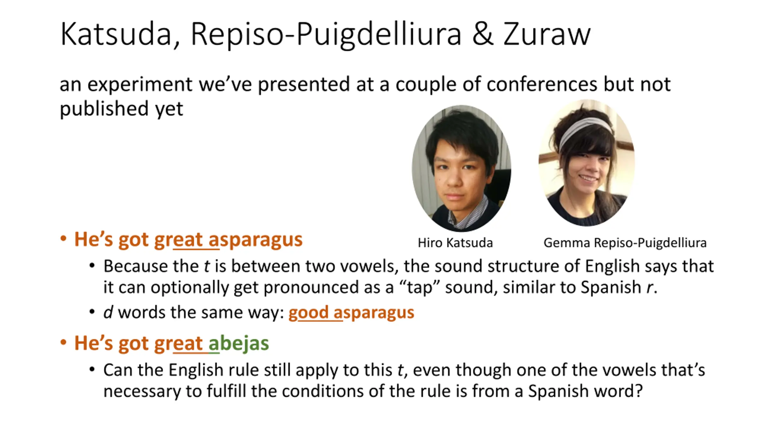 Katsuda, Repiso-Puigdelliura & Zuraw an experiment we ve presented at a couple of conferences but not published yet He s got great asparagus Because the t is between two vowels, the sound structure of English says that it can optionally get pronounced as a tap sound, similar to Spanish r. d words the same way: good asparagus He s got great abejas Can the English rule still apply to this t, even though one of the vowels that s necessary to fulfill the conditions of the rule is from a Spanish word? Hiro Katsuda Gemma Repiso-Puigdelliura