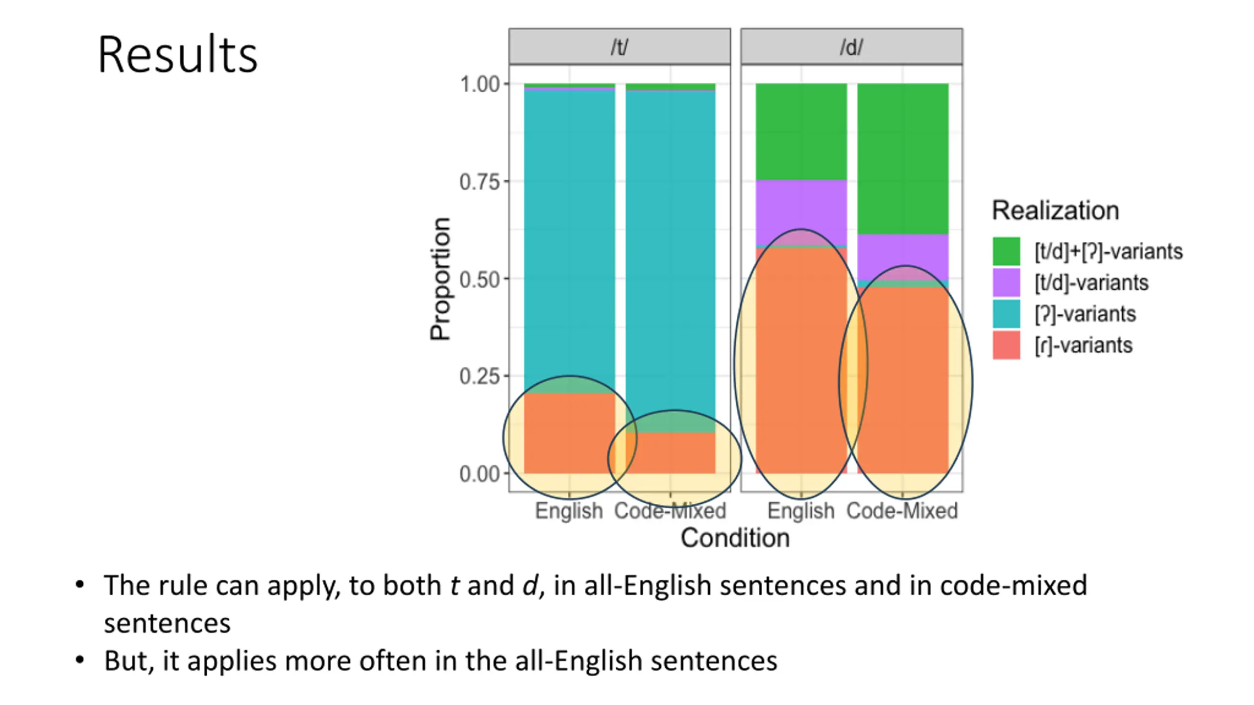 Results The rule can apply, to both t and d, in all-English sentences and in code-mixed sentences But, it applies more often in the all-English sentences