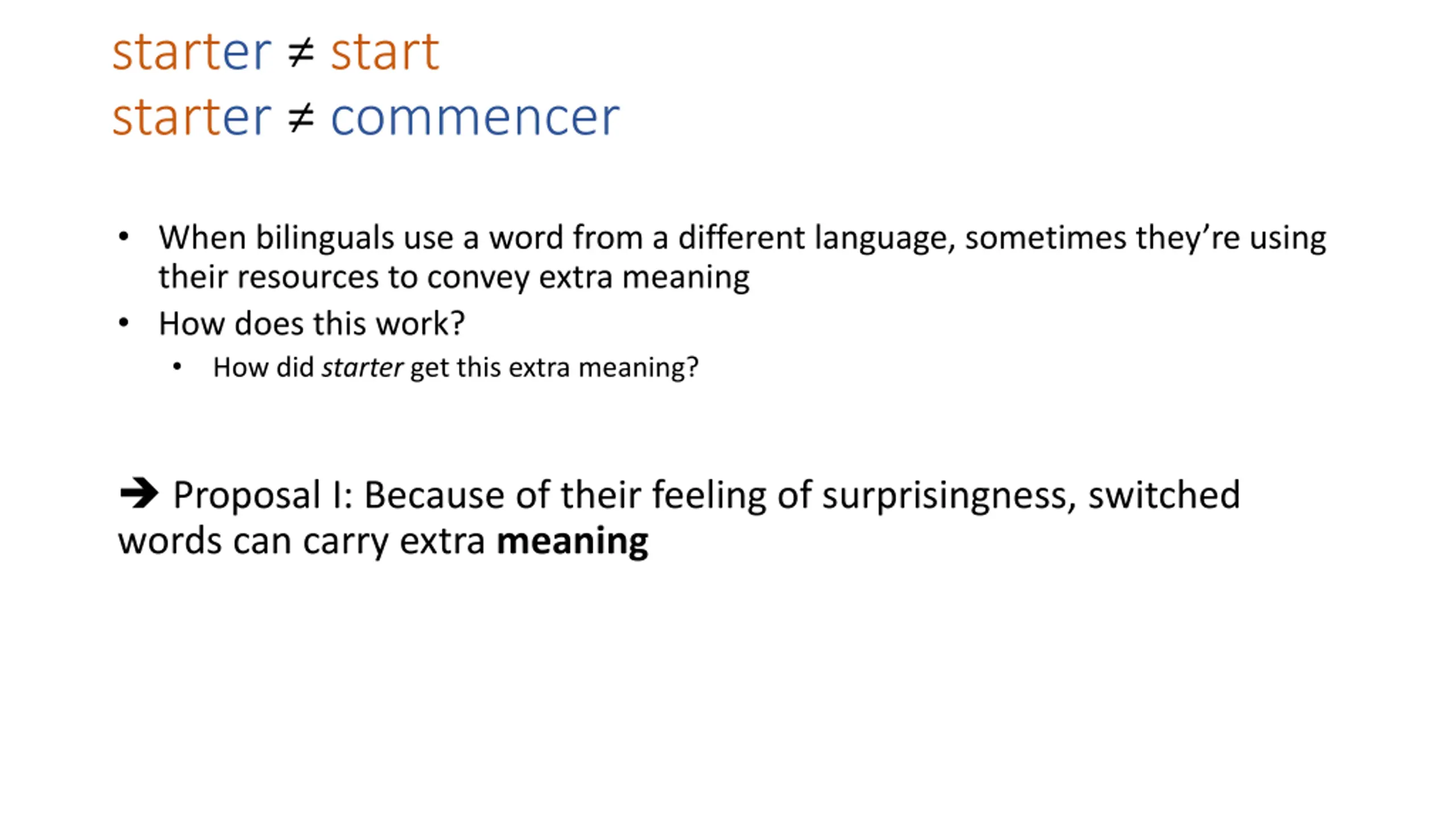starter start starter commencer When bilinguals use a word from a different language, sometimes they re using their resources to convey extra meaning How does this work? How did starter get this extra meaning? Proposal I: Because of their feeling of surprisingness, switched words can carry extra meaning
