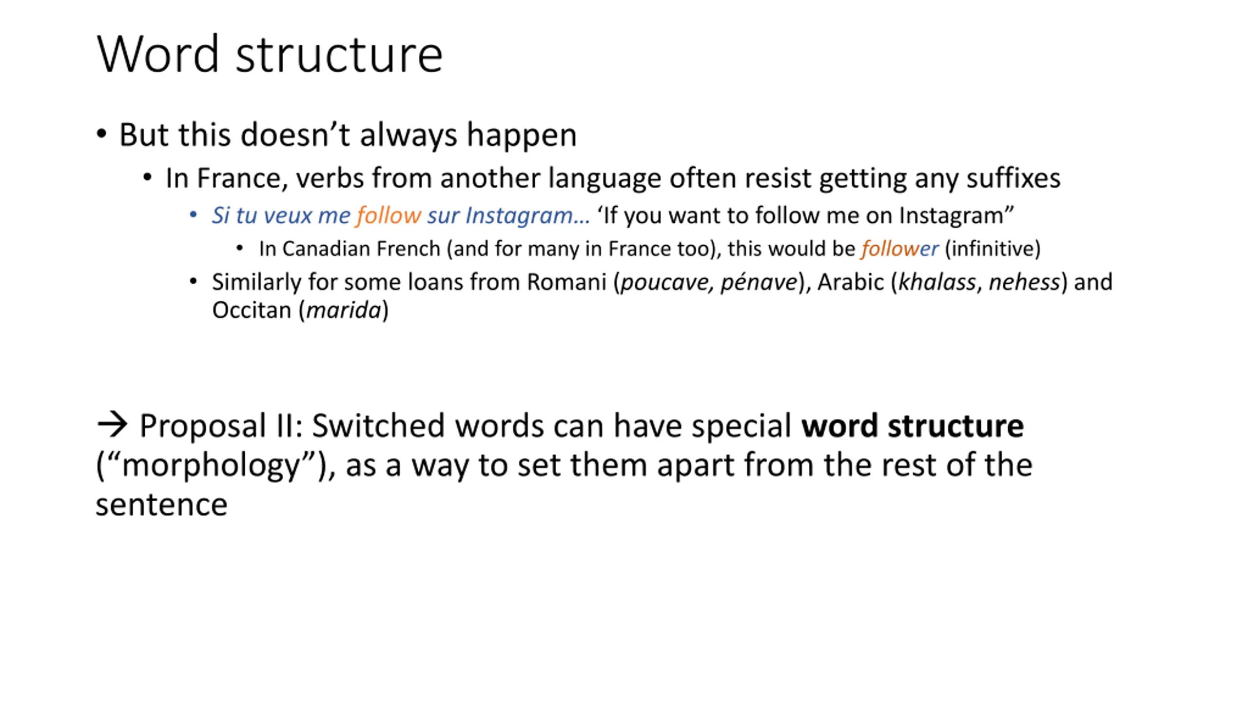 Word structure But this doesn t always happen In France, verbs from another language often resist getting any suffixes Si tu veux me follow sur Instagram If you want to follow me on Instagram In Canadian French (and for many in France too), this would be follower (infinitive) Similarly for some loans from Romani (poucave, p nave), Arabic (khalass, nehess) and Occitan (marida) Proposal II: Switched words can have special word structure ( morphology ), as a way to set them apart from the rest of the sentence