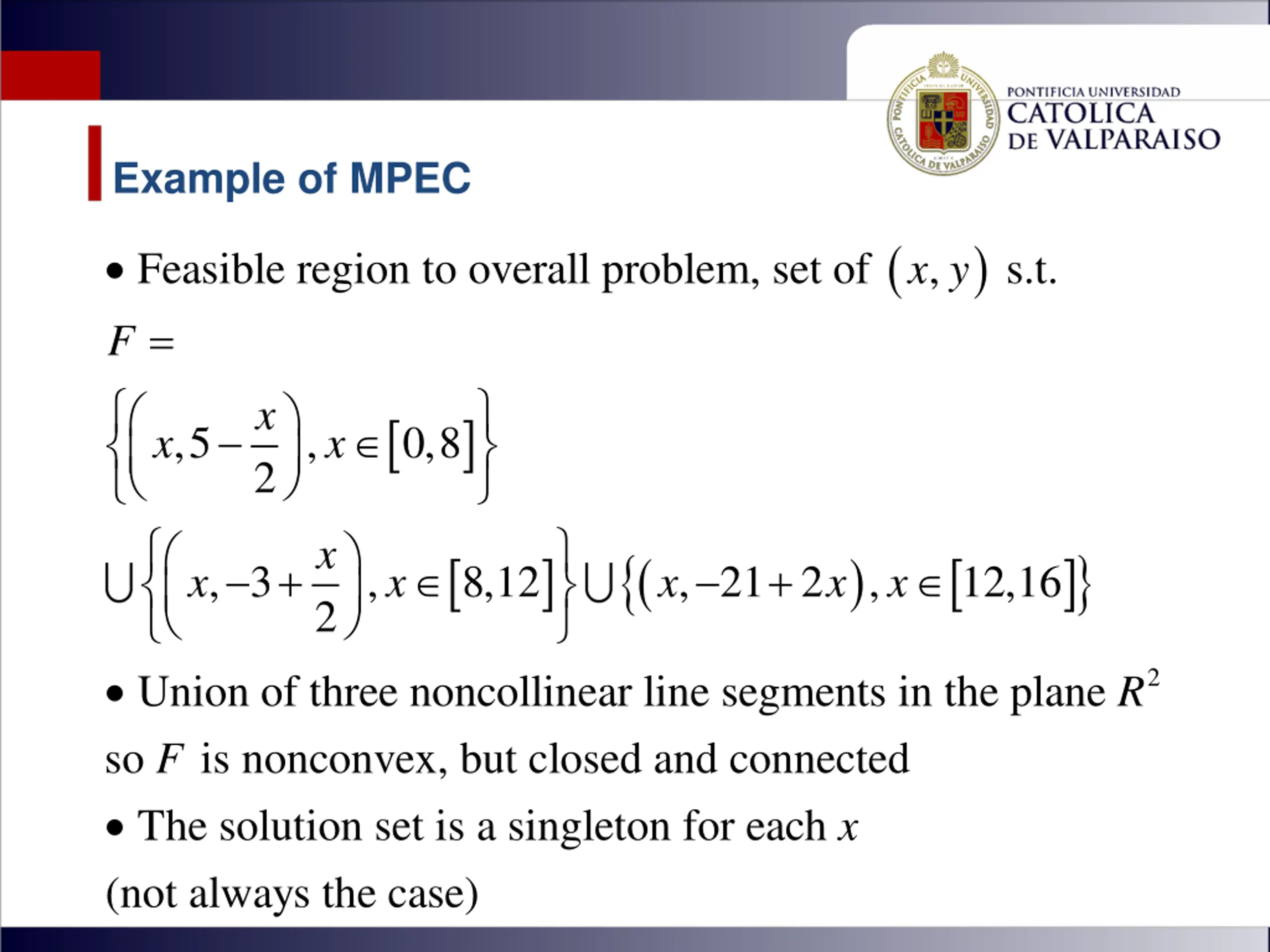 Example of MPEC ( ) Feasible region to overall problem, set of F = + but closed and connected The solution set is a singleton for each (not always the case) , s.t. x y x ,5 , 0,8 x x 2 x ( ) , 21 2 + , 3 , 8,12 , 12,16 x x x x x 2 2 Union of three noncollinear line segments in the plane so is nonconvex, F R x