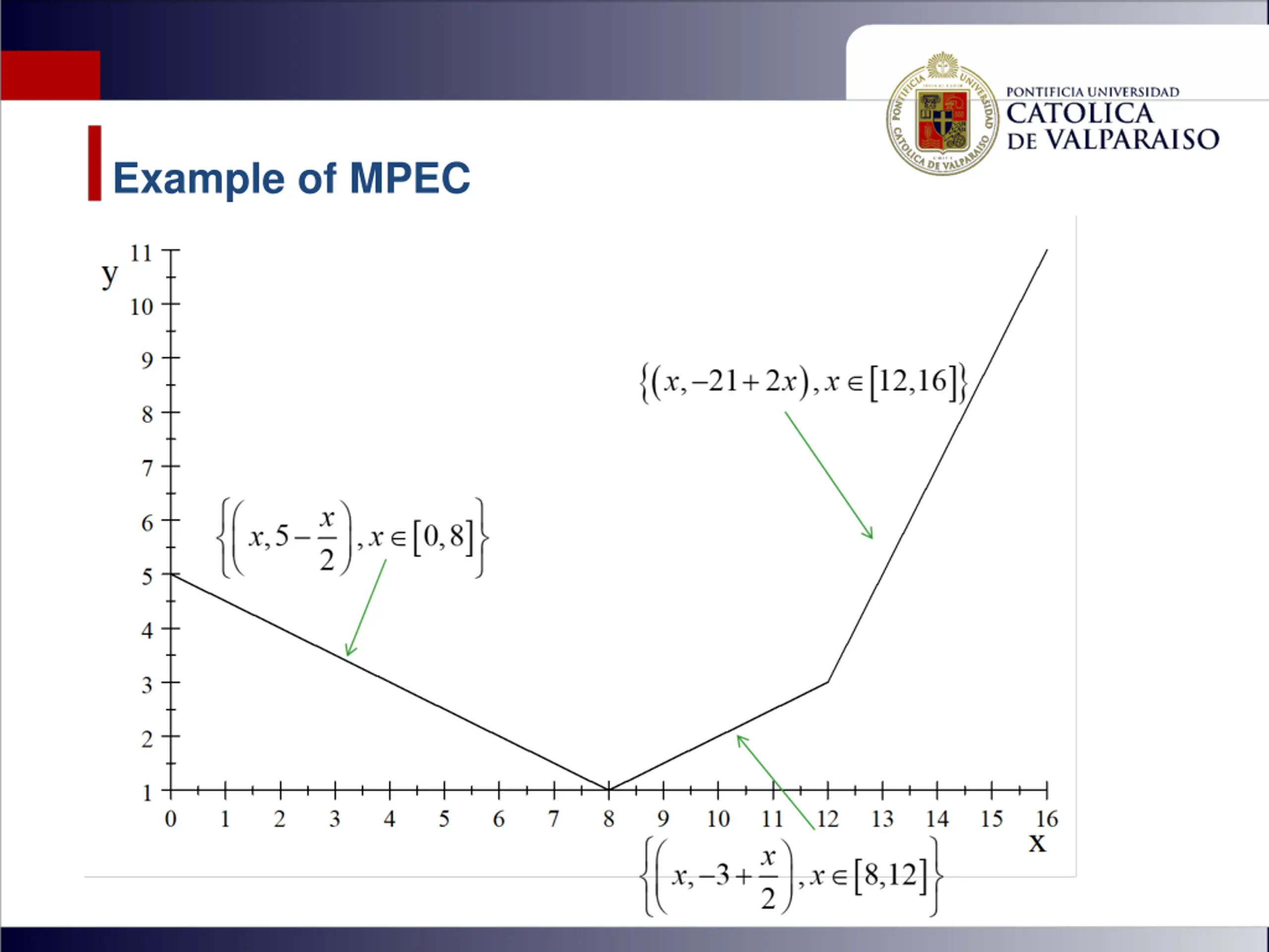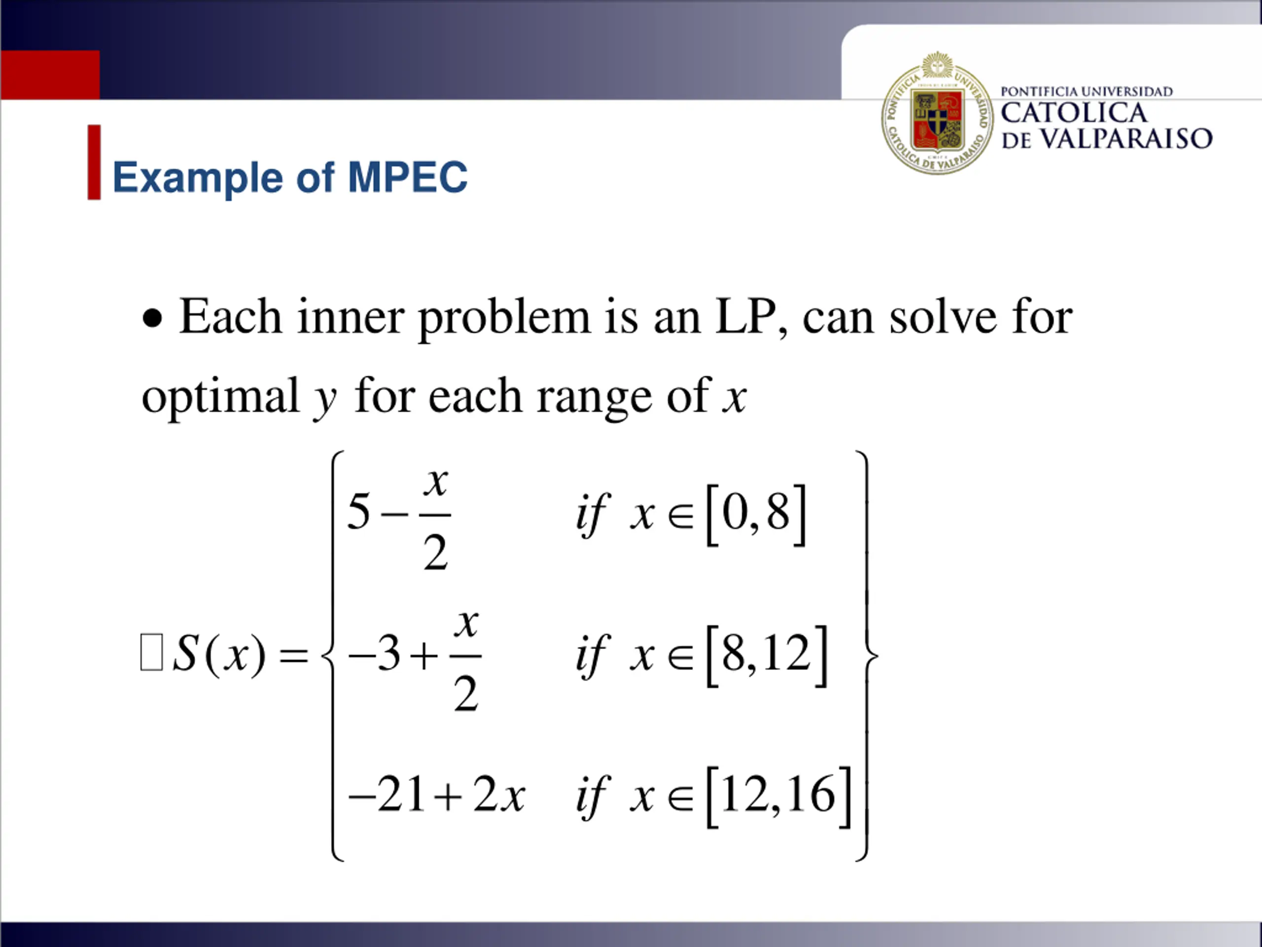 Example of MPEC Each inner problem is an LP, can solve for optimal for each range of y x if x = + + x 5 0,8 2 x ( ) S x 3 8,12 if x 2 21 2 12,16 x if x