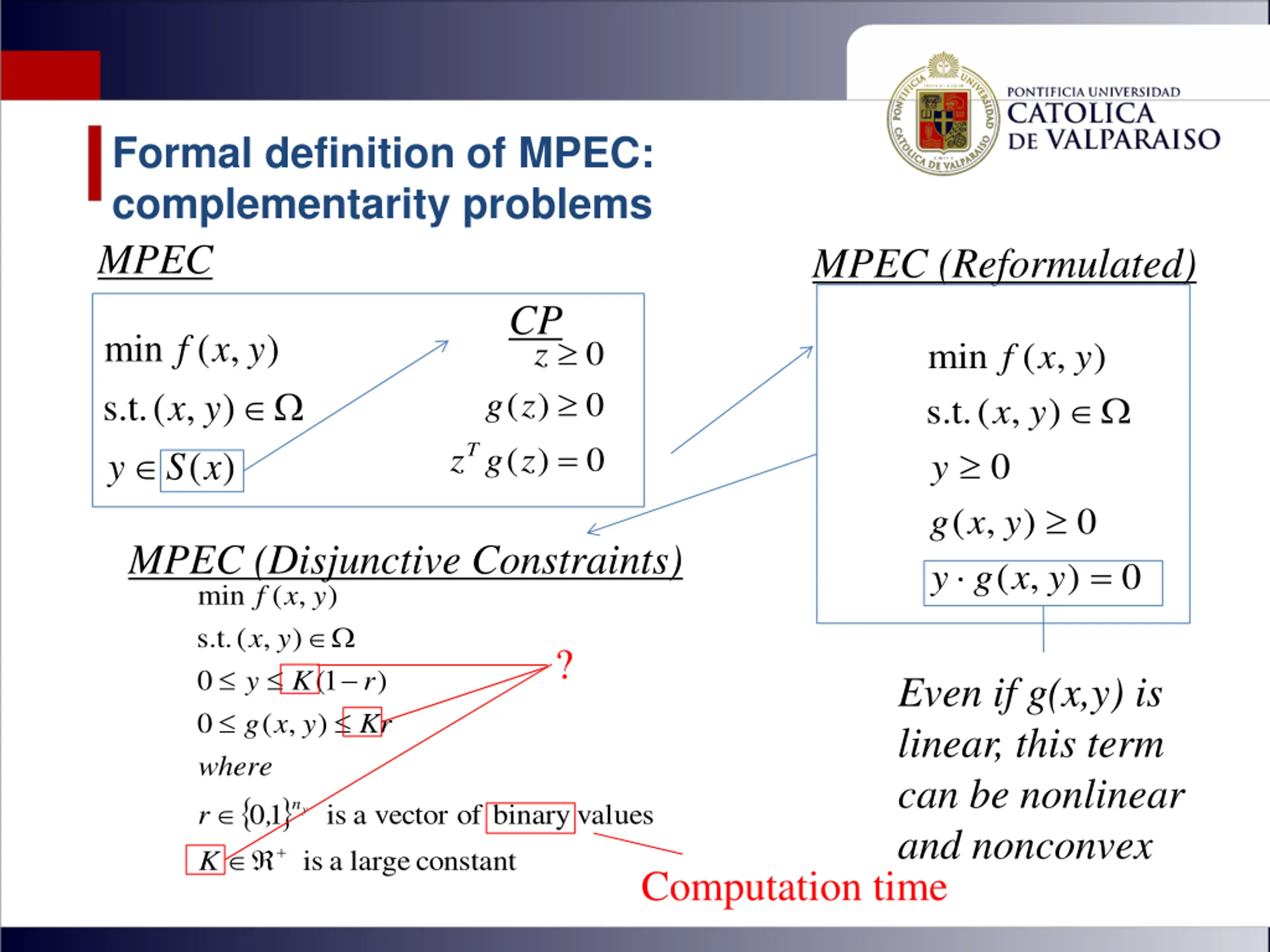 Formal definition of MPEC: complementarity problems MPEC MPEC (Reformulated) CP min ( , ) f x y 0 z min ( , ) f x y s.t. y ( , ) ( ) 0 x y g z s.t. y ( x , ) x y = T ( ) 0 z g z ( ) S x 0 y ( , ) 0 g y MPEC (Disjunctive Constraints) ) , ( min r K y = ( , ) 0 y g x f x y s.t. ( , ) x y ? 0 1 ( y ) Even if g(x,y) is linear, this term can be nonlinear and nonconvex 0 where ( , ) g x Kr 0 n 1 , is a vector of binary val ues r y + a is large constant K Computation time