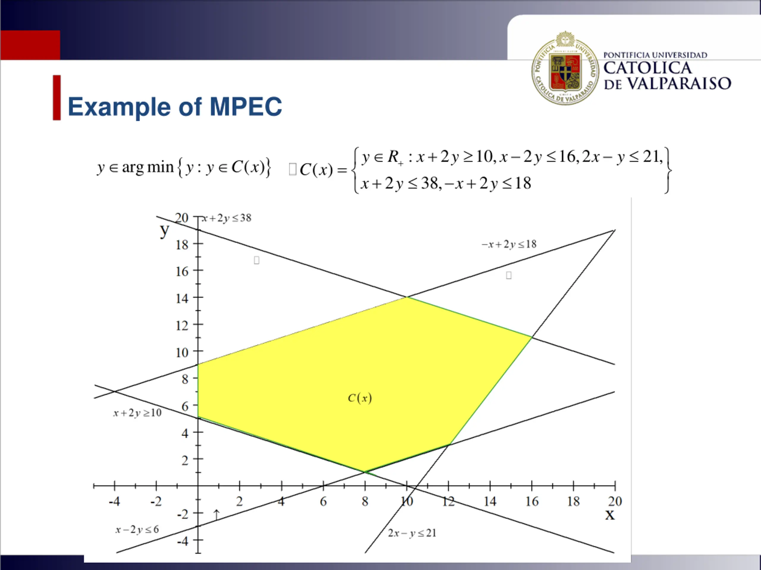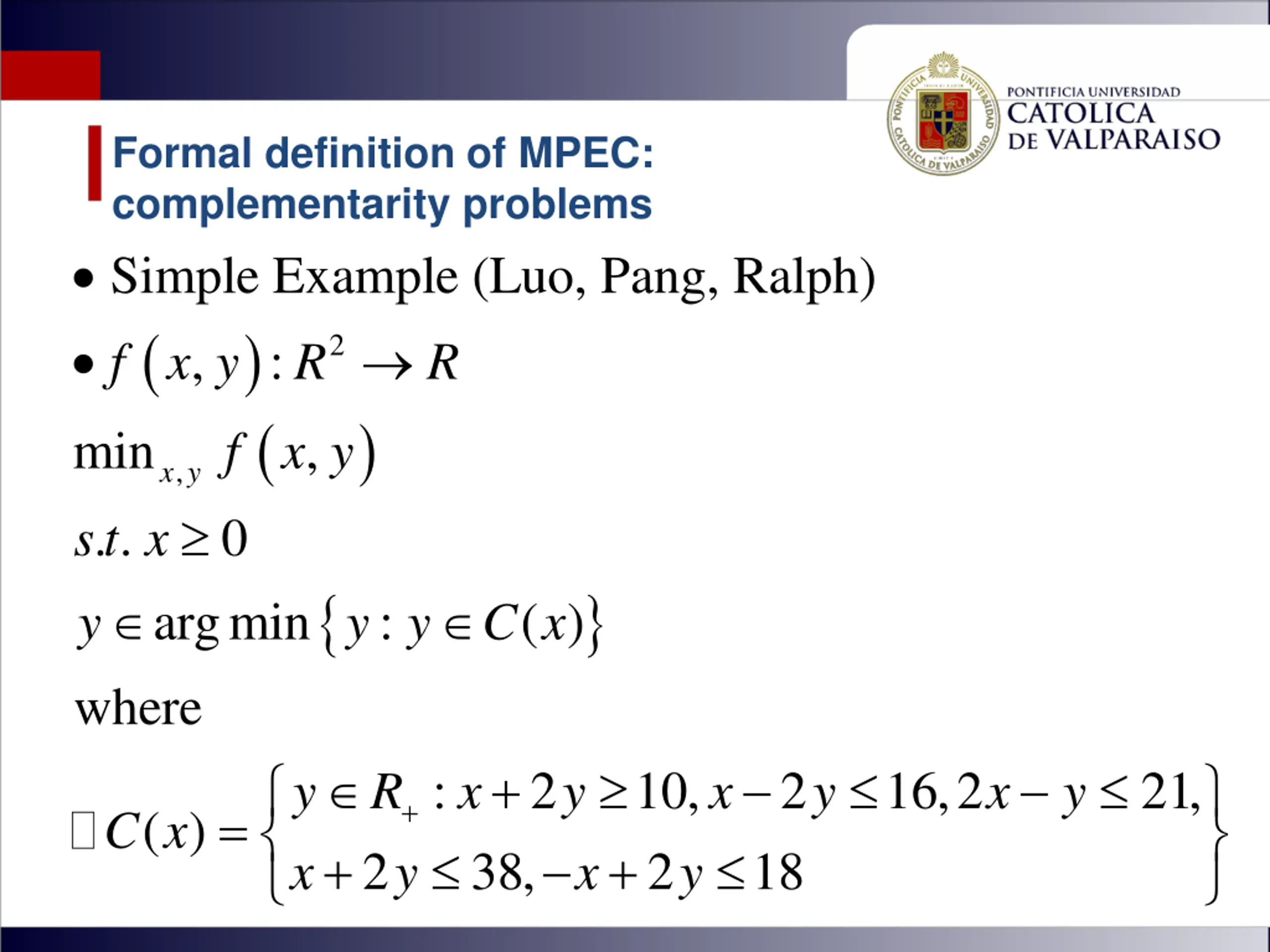 Formal definition of MPEC: complementarity problems Simple Example (Luo, Pang, Ralph) , : f x y R R ( ) 2 ( ) min , f x y , x y . . st x y 0 argmin : ( ) y y C x where + + : 2 + 10, 2 2 16,2 21, y x R x y x y x y + = ( ) C x 2 38, 18 y x y