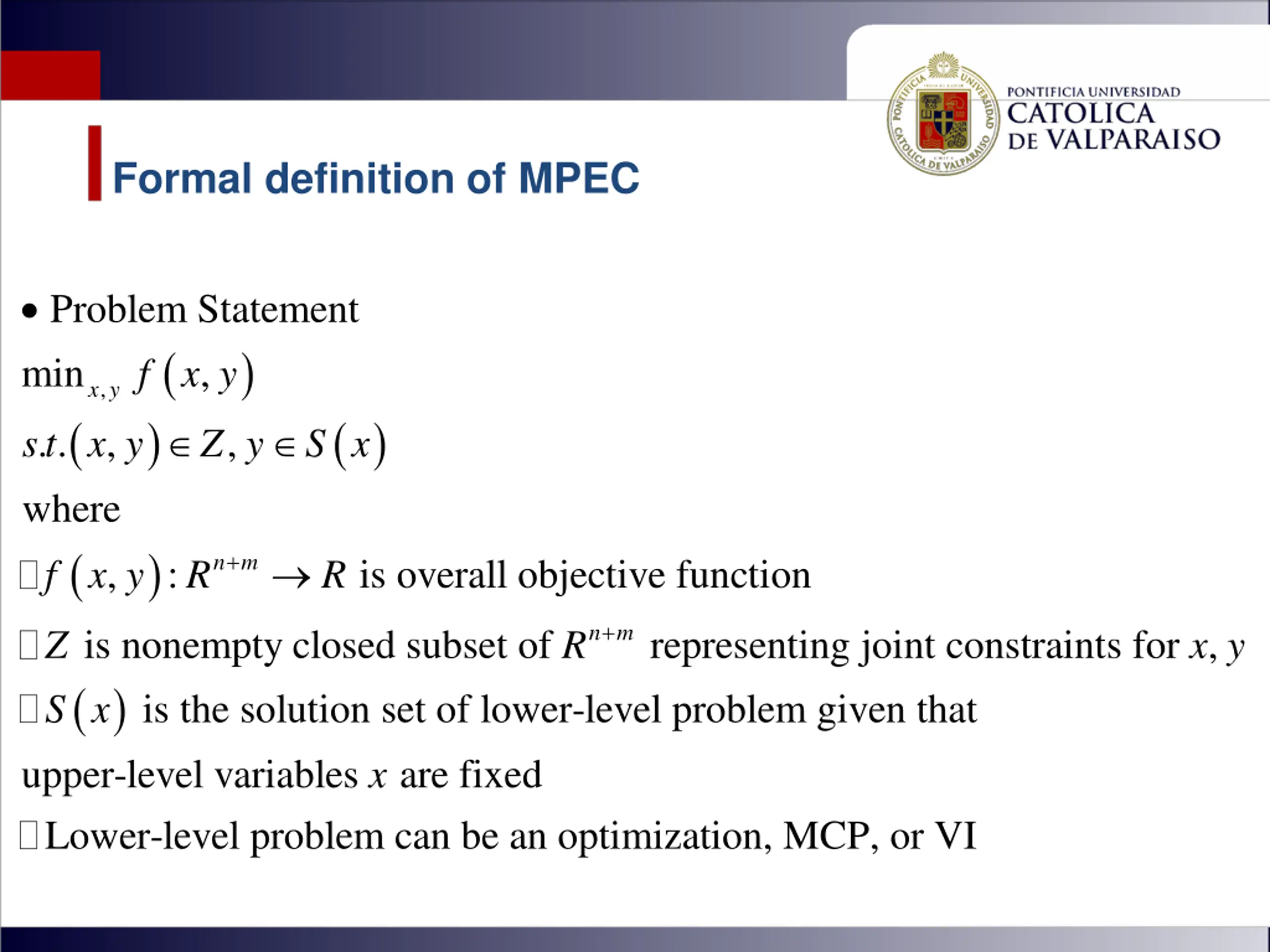 Formal definition of MPEC Problem Statement min x y f x y st x y ( ) , , ( ) ( ) . . , , Z y S x where f x y ( ) n m + , : is overall objective function R R n m + is nonempty closed subset of is the solution set of lowe S x upper-level variables are fixed Lower-level problem can be an optimization, MCP, or VI representing joint constraints for , r-level problem given that Z R x y ( ) x