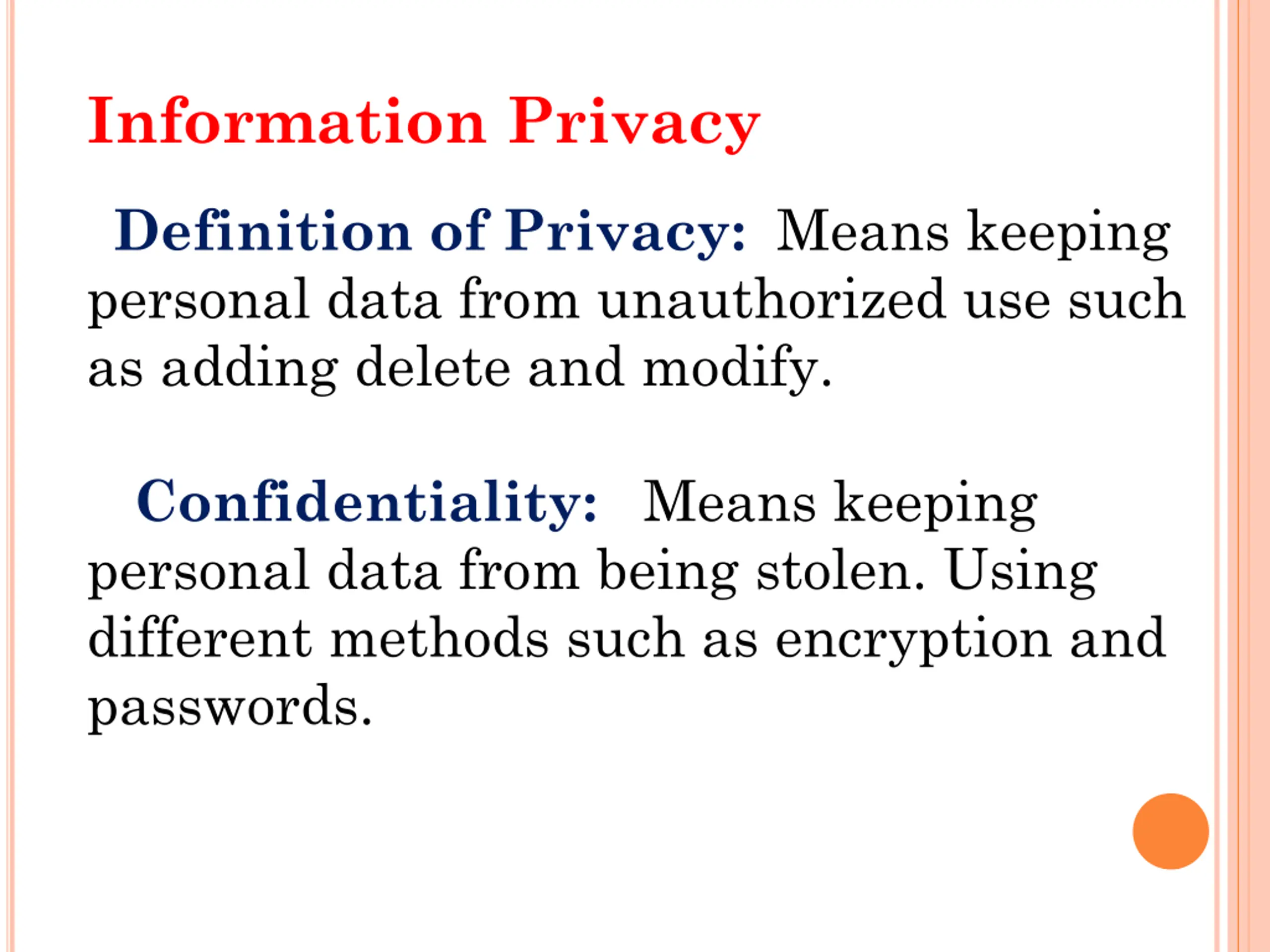 Information Privacy Definition of Privacy: Means keeping personal data from unauthorized use such as adding delete and modify. Confidentiality: Means keeping personal data from being stolen. Using different methods such as encryption and passwords.