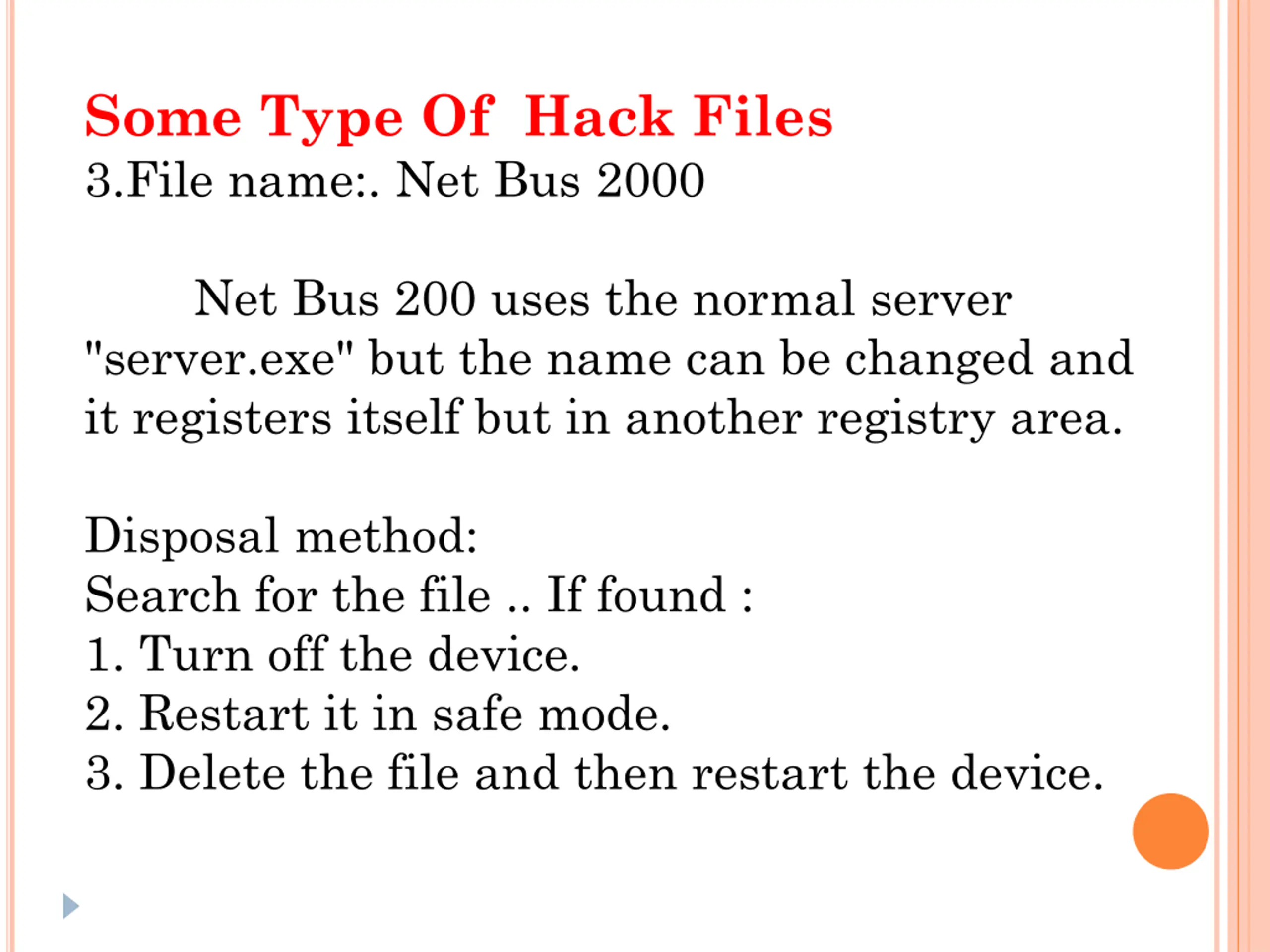 Some Type Of Hack Files 3.File name:. Net Bus 2000 Net Bus 200 uses the normal server "server.exe" but the name can be changed and it registers itself but in another registry area. Disposal method: Search for the file .. If found : 1. Turn off the device. 2. Restart it in safe mode. 3. Delete the file and then restart the device.