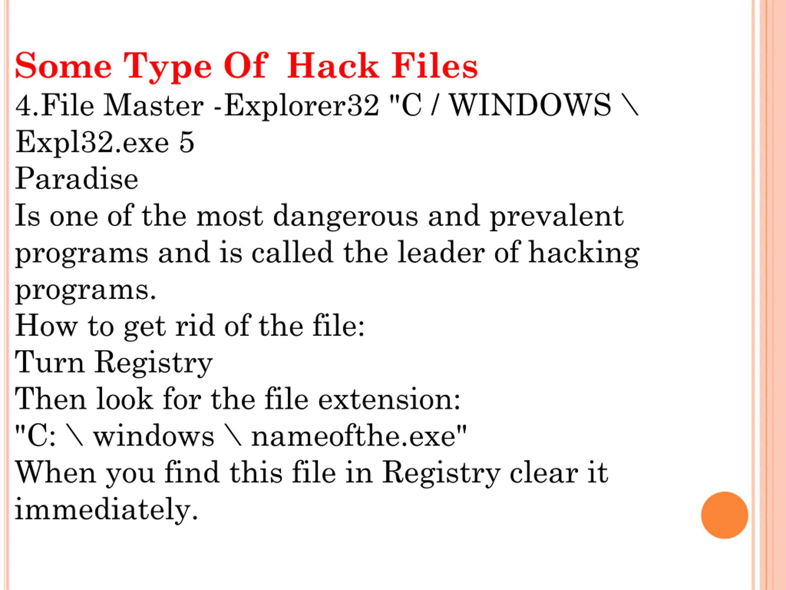 Some Type Of Hack Files 4.File Master -Explorer32 "C / WINDOWS \ Expl32.exe 5 Paradise Is one of the most dangerous and prevalent programs and is called the leader of hacking programs. How to get rid of the file: Turn Registry Then look for the file extension: "C: \ windows \ nameofthe.exe" When you find this file in Registry clear it immediately.