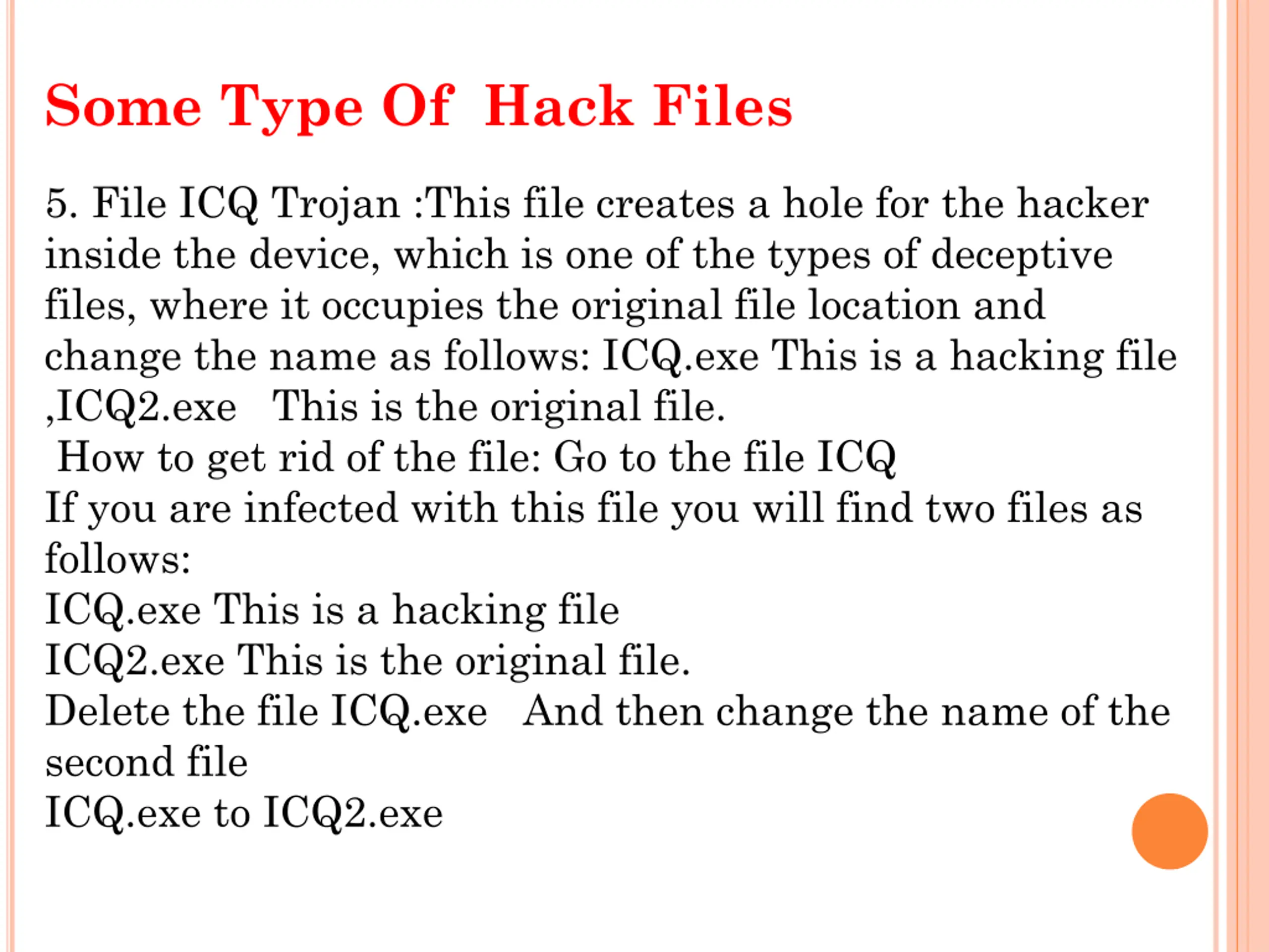 Some Type Of Hack Files 5. File ICQ Trojan :This file creates a hole for the hacker inside the device, which is one of the types of deceptive files, where it occupies the original file location and change the name as follows: ICQ.exe This is a hacking file ,ICQ2.exe This is the original file. How to get rid of the file: Go to the file ICQ If you are infected with this file you will find two files as follows: ICQ.exe This is a hacking file ICQ2.exe This is the original file. Delete the file ICQ.exe And then change the name of the second file ICQ.exe to ICQ2.exe