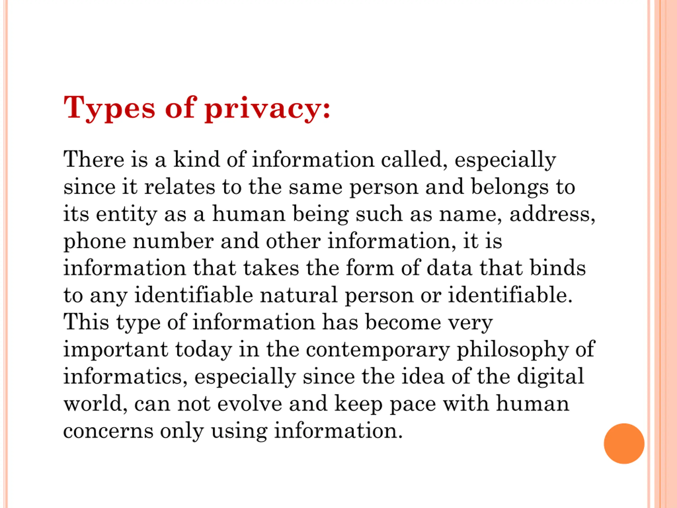 Types of privacy: There is a kind of information called, especially since it relates to the same person and belongs to its entity as a human being such as name, address, phone number and other information, it is information that takes the form of data that binds to any identifiable natural person or identifiable. This type of information has become very important today in the contemporary philosophy of informatics, especially since the idea of the digital world, can not evolve and keep pace with human concerns only using information.