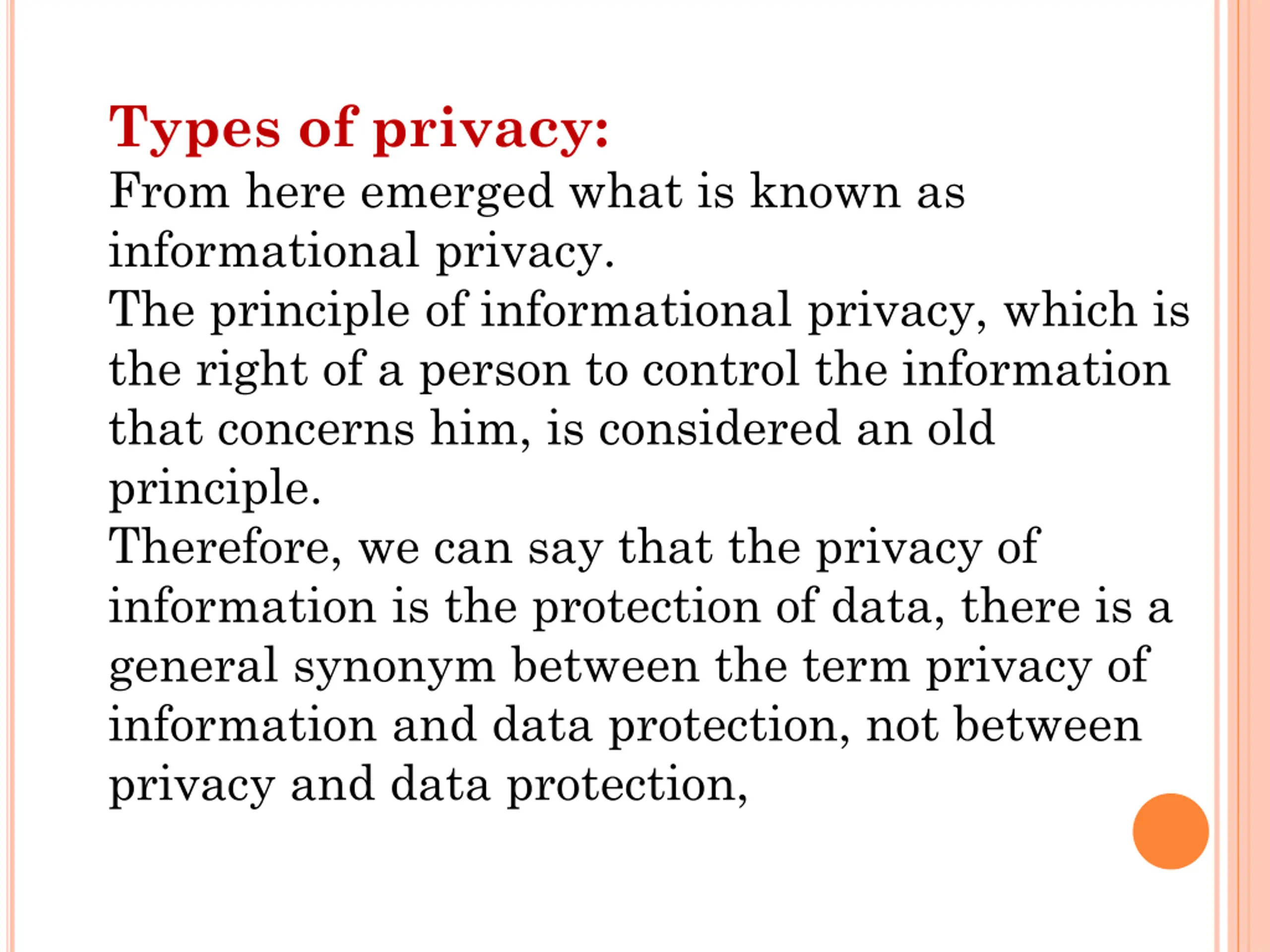 Types of privacy: From here emerged what is known as informational privacy. The principle of informational privacy, which is the right of a person to control the information that concerns him, is considered an old principle. Therefore, we can say that the privacy of information is the protection of data, there is a general synonym between the term privacy of information and data protection, not between privacy and data protection,