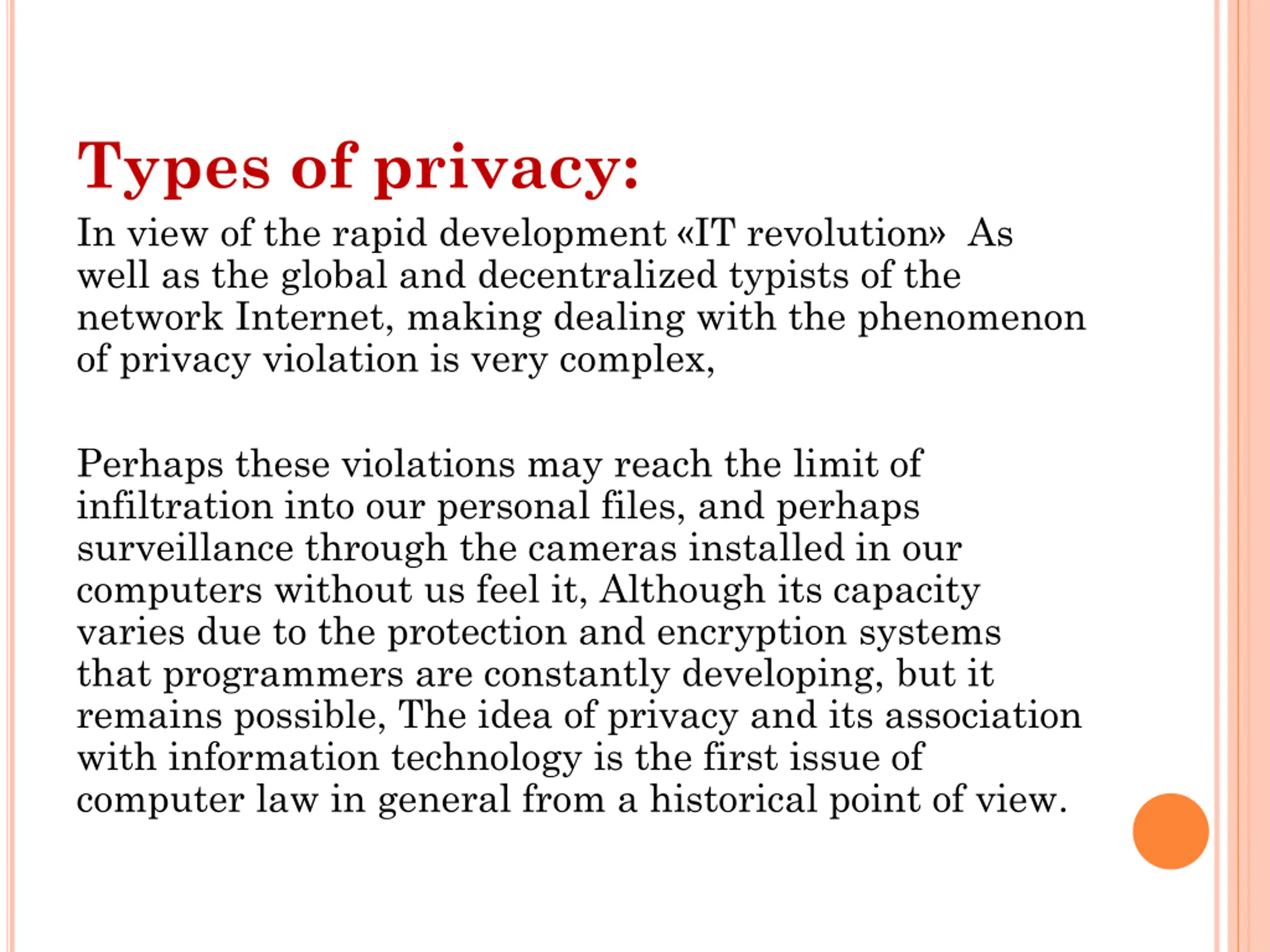 Types of privacy: In view of the rapid development IT revolution As well as the global and decentralized typists of the network Internet, making dealing with the phenomenon of privacy violation is very complex, Perhaps these violations may reach the limit of infiltration into our personal files, and perhaps surveillance through the cameras installed in our computers without us feel it, Although its capacity varies due to the protection and encryption systems that programmers are constantly developing, but it remains possible, The idea of privacy and its association with information technology is the first issue of computer law in general from a historical point of view.