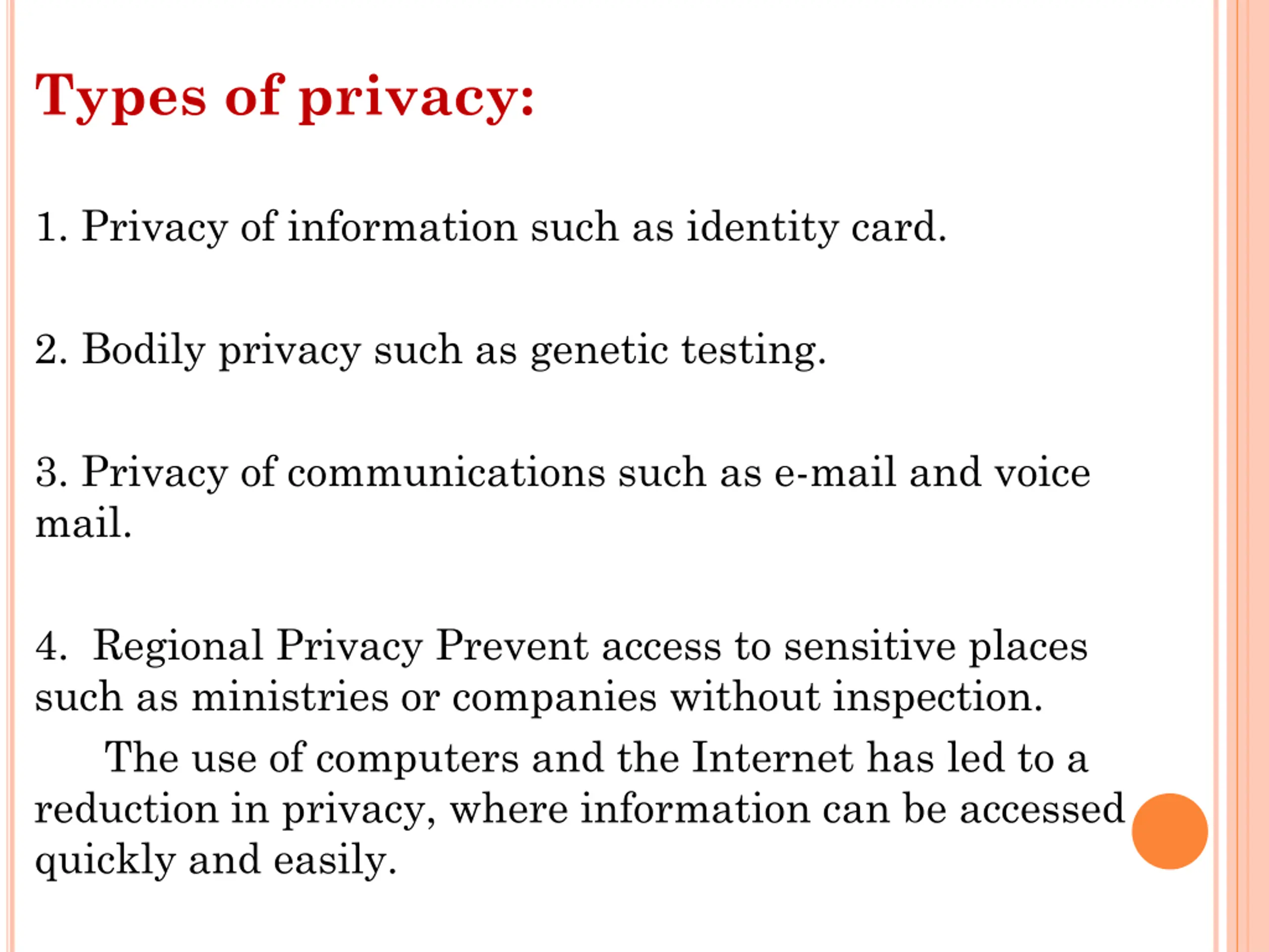 Types of privacy: 1. Privacy of information such as identity card. 2. Bodily privacy such as genetic testing. 3. Privacy of communications such as e-mail and voice mail. 4. Regional Privacy Prevent access to sensitive places such as ministries or companies without inspection. The use of computers and the Internet has led to a reduction in privacy, where information can be accessed quickly and easily.