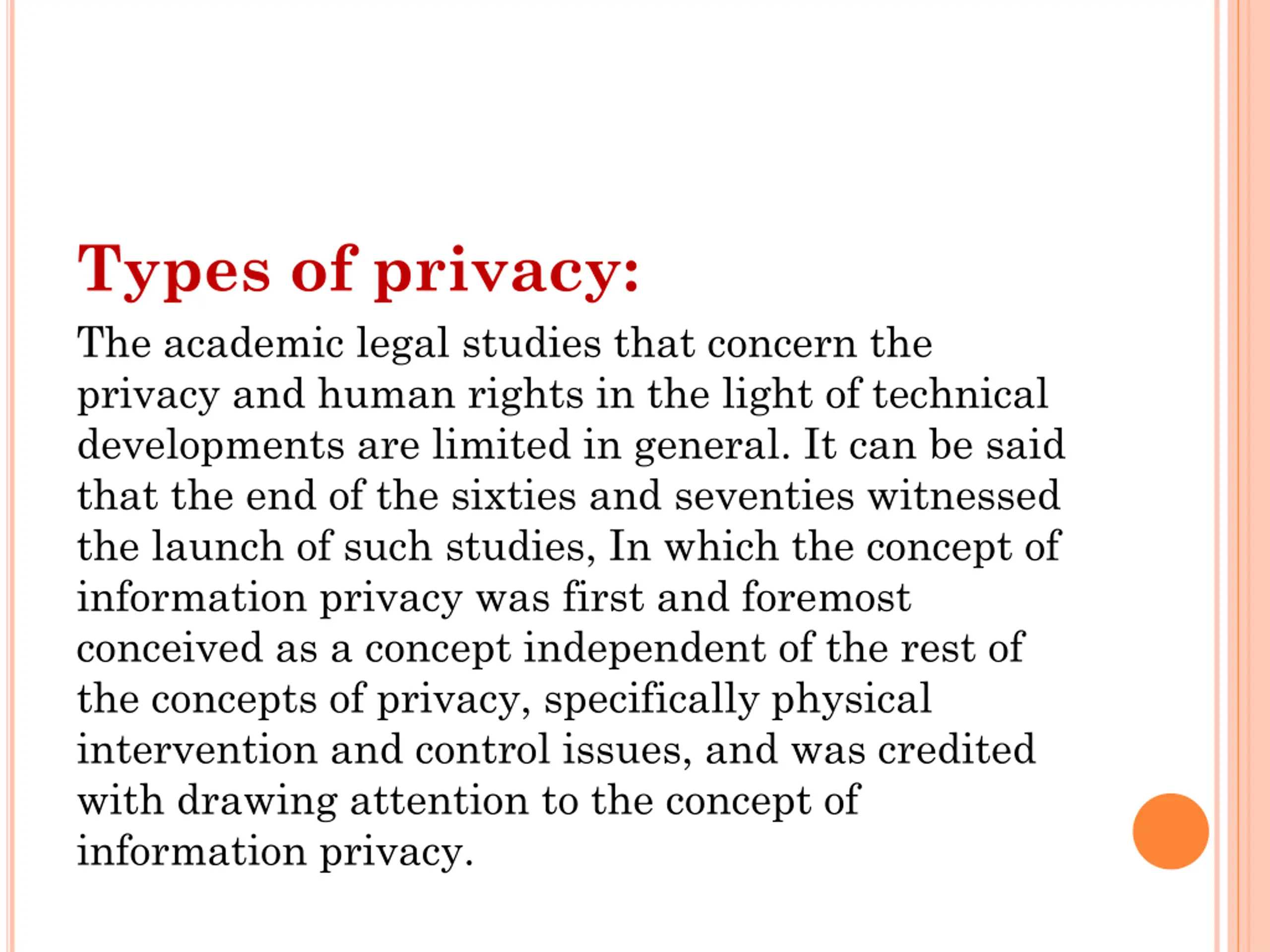Types of privacy: The academic legal studies that concern the privacy and human rights in the light of technical developments are limited in general. It can be said that the end of the sixties and seventies witnessed the launch of such studies, In which the concept of information privacy was first and foremost conceived as a concept independent of the rest of the concepts of privacy, specifically physical intervention and control issues, and was credited with drawing attention to the concept of information privacy.