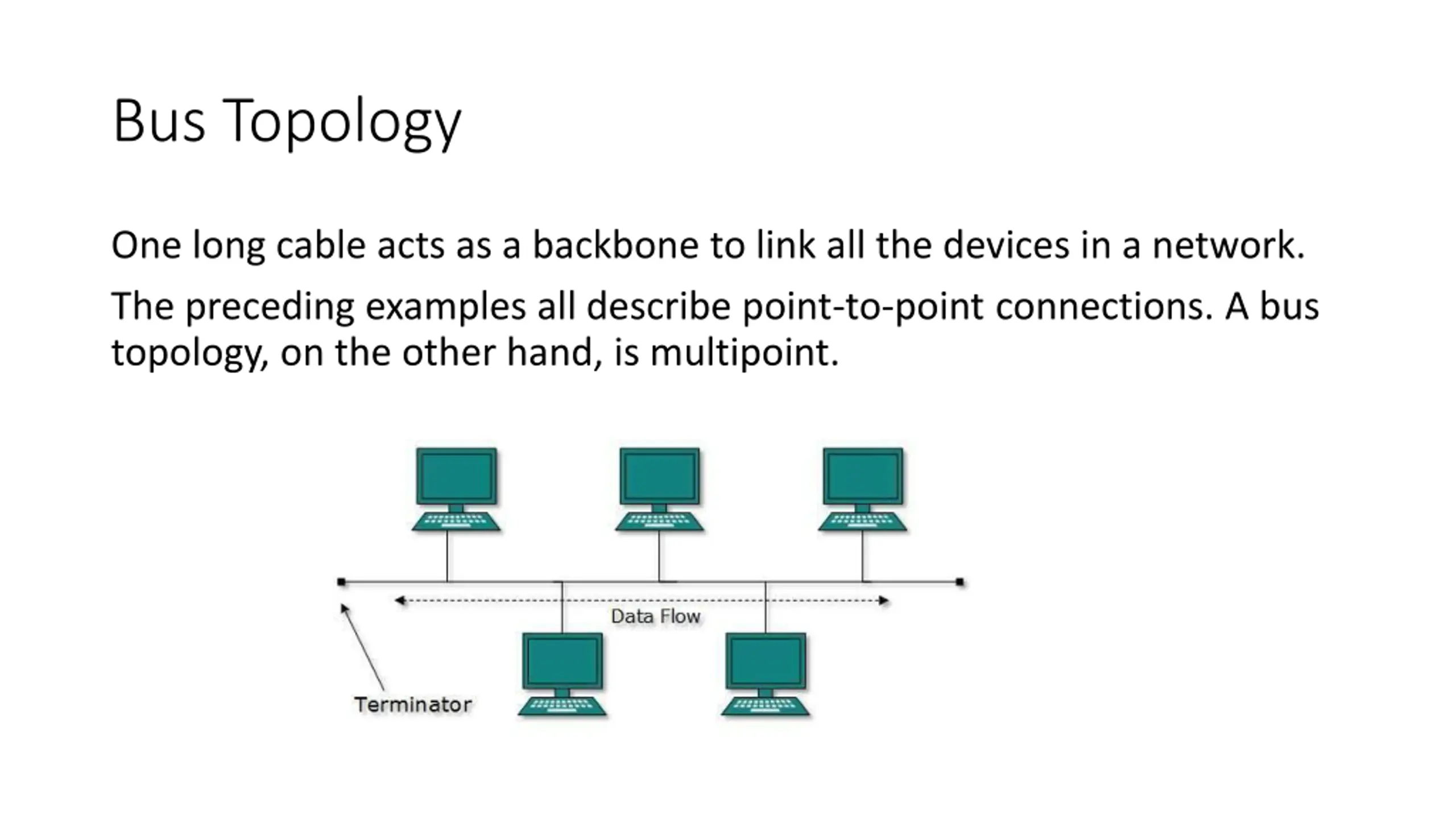 Bus Topology One long cable acts as a backbone to link all the devices in a network. The preceding examples all describe point-to-point connections. A bus topology, on the other hand, is multipoint.