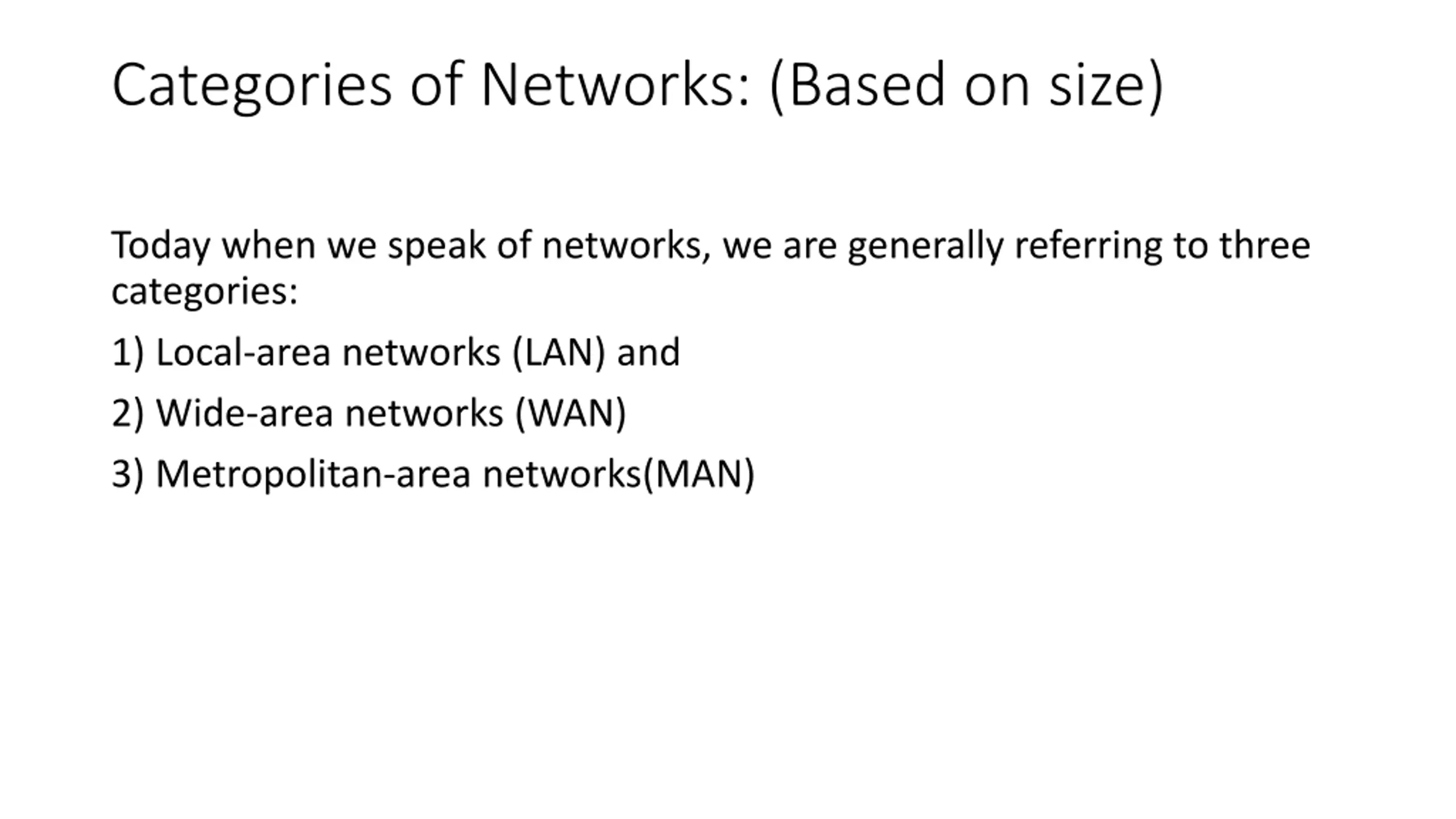 Categories of Networks: (Based on size) Today when we speak of networks, we are generally referring to three categories: 1) Local-area networks (LAN) and 2) Wide-area networks (WAN) 3) Metropolitan-area networks(MAN)