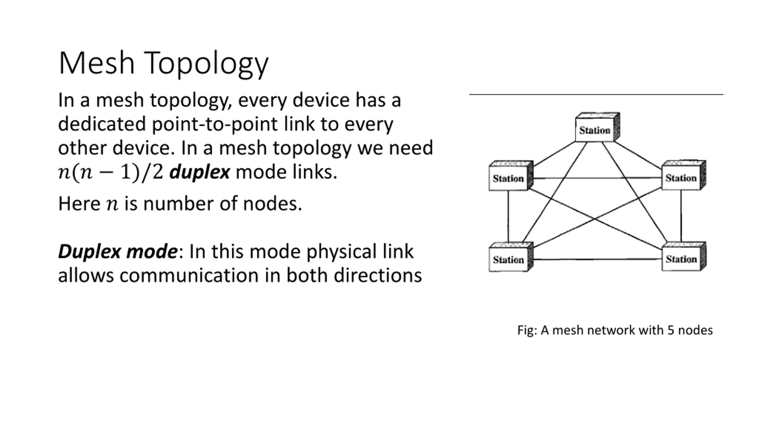 Mesh Topology In a mesh topology, every device has a dedicated point-to-point link to every other device. In a mesh topology we need ?(? 1)/2duplex mode links. Here ? is number of nodes. Duplex mode: In this mode physical link allows communication in both directions Fig: A mesh network with 5 nodes