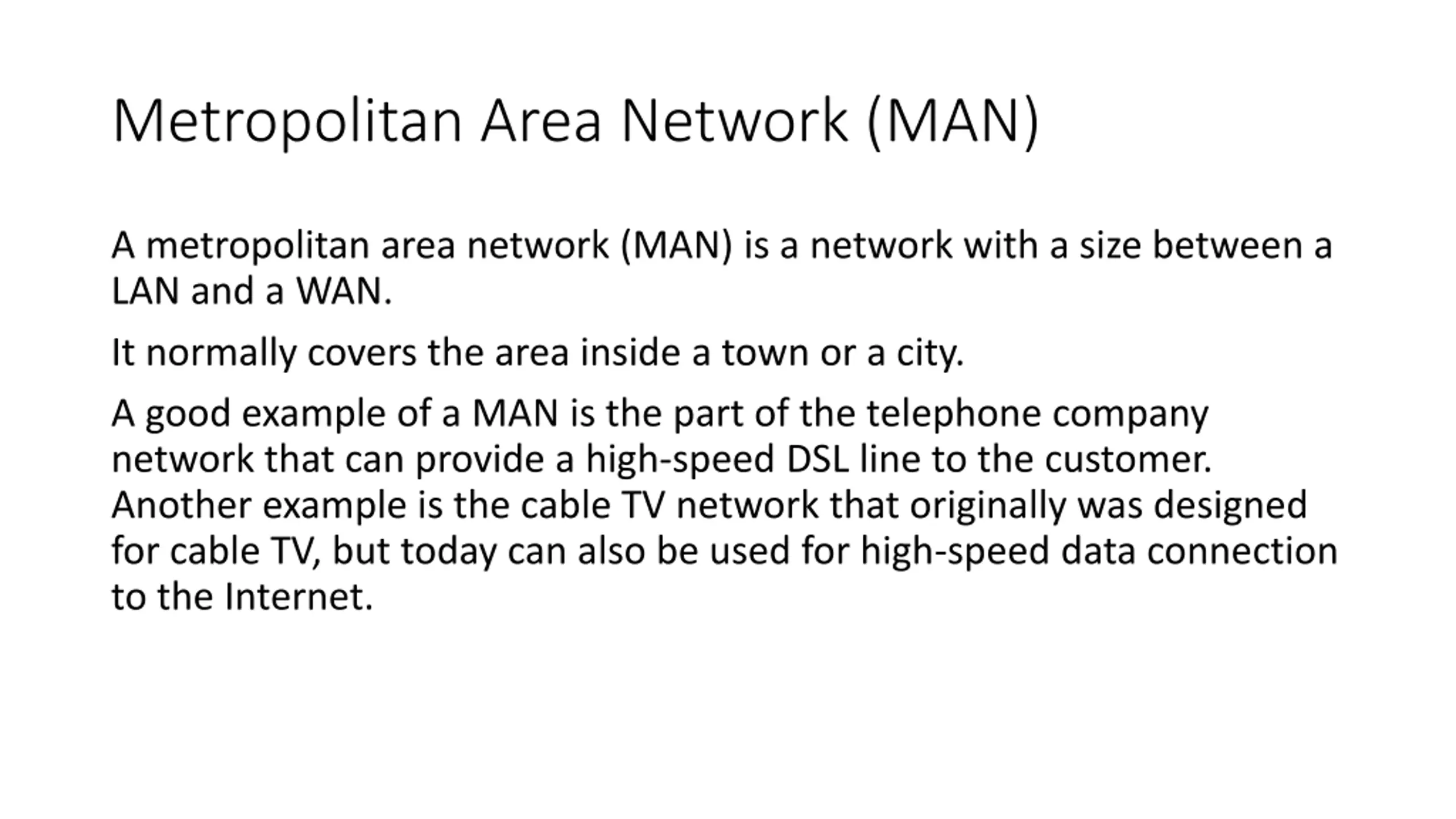 Metropolitan Area Network (MAN) A metropolitan area network (MAN) is a network with a size between a LAN and a WAN. It normally covers the area inside a town or a city. A good example of a MAN is the part of the telephone company network that can provide a high-speed DSL line to the customer. Another example is the cable TV network that originally was designed for cable TV, but today can also be used for high-speed data connection to the Internet.
