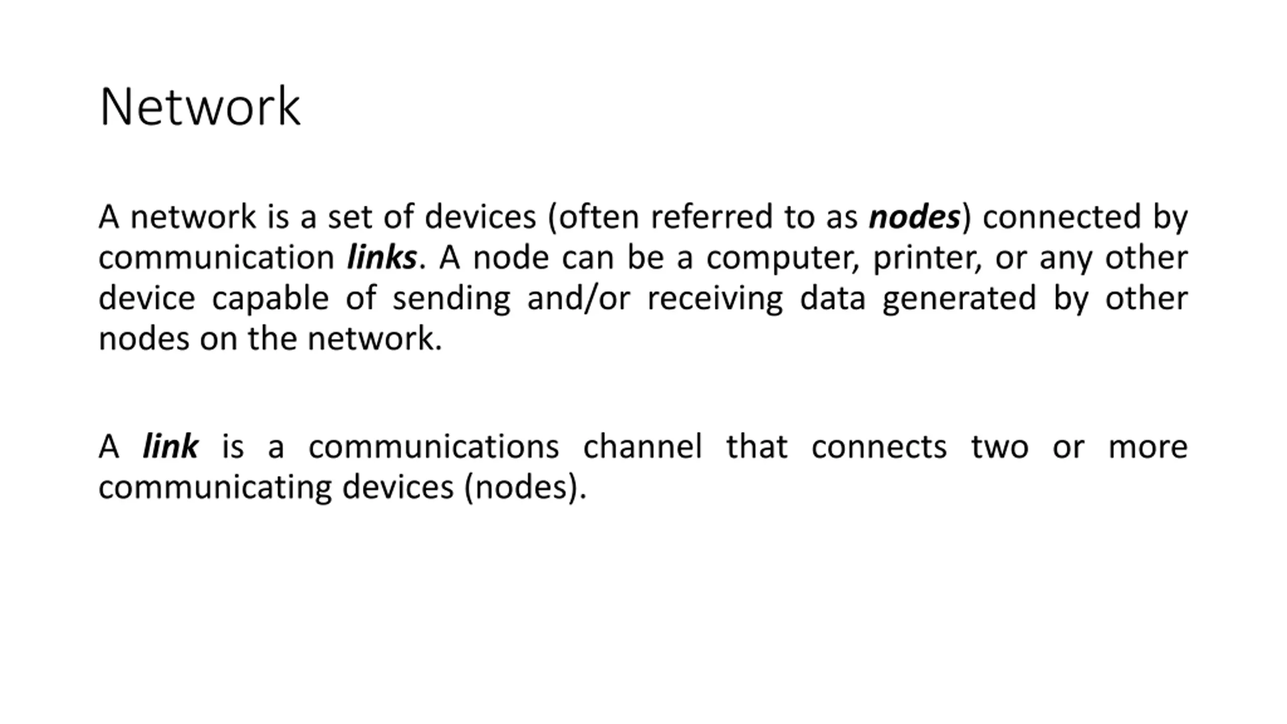 Network A network is a set of devices (often referred to as nodes) connected by communication links. A node can be a computer, printer, or any other device capable of sending and/or receiving data generated by other nodes on the network. A link is a communications channel that connects two or more communicating devices (nodes).