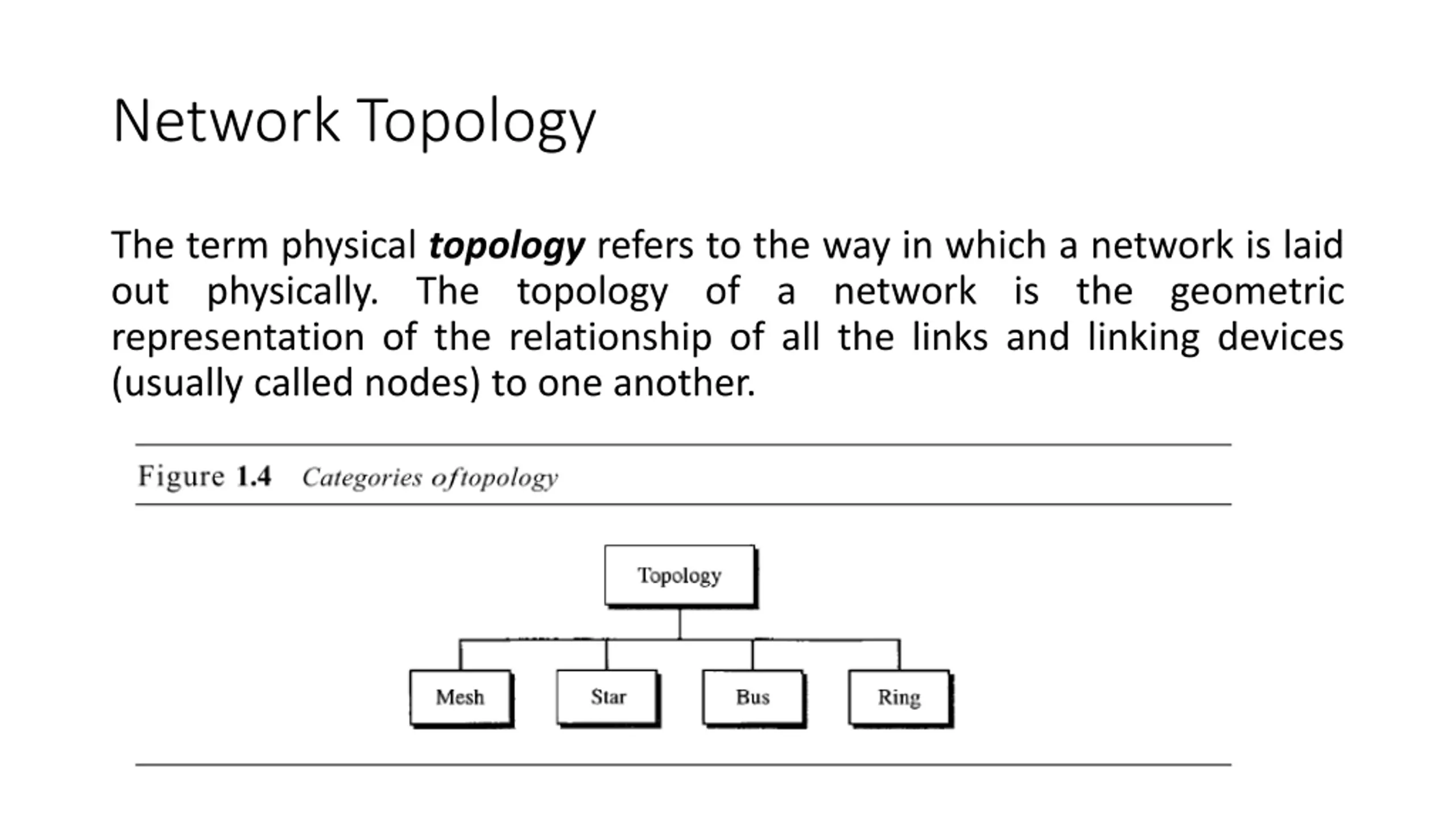 Network Topology The term physical topology refers to the way in which a network is laid out physically. The topology of a network is the geometric representation of the relationship of all the links and linking devices (usually called nodes) to one another.