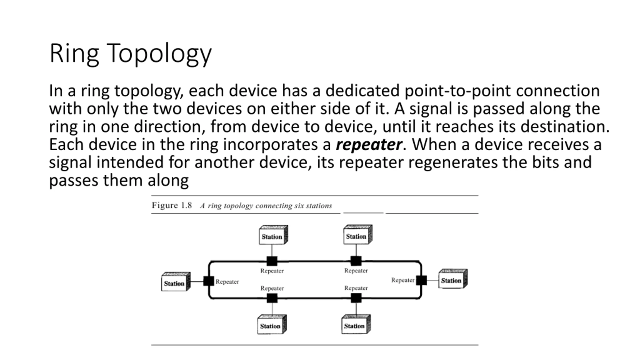 Ring Topology In a ring topology, each device has a dedicated point-to-point connection with only the two devices on either side of it. A signal is passed along the ring in one direction, from device to device, until it reaches its destination. Each device in the ring incorporates a repeater. When a device receives a signal intended for another device, its repeater regenerates the bits and passes them along