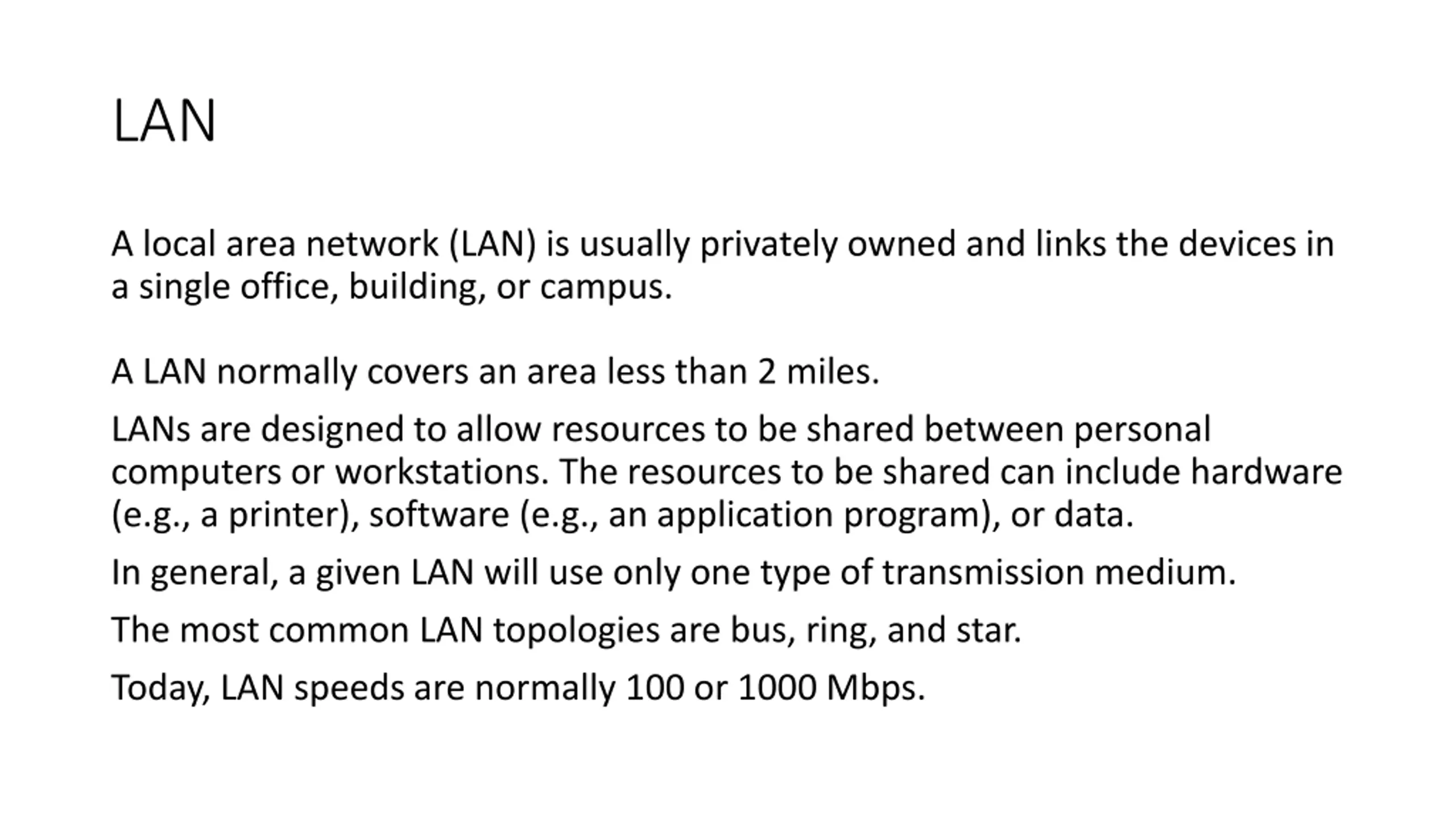 LAN A local area network (LAN) is usually privately owned and links the devices in a single office, building, or campus. A LAN normally covers an area less than 2 miles. LANs are designed to allow resources to be shared between personal computers or workstations. The resources to be shared can include hardware (e.g., a printer), software (e.g., an application program), or data. In general, a given LAN will use only one type of transmission medium. The most common LAN topologies are bus, ring, and star. Today, LAN speeds are normally 100 or 1000 Mbps.