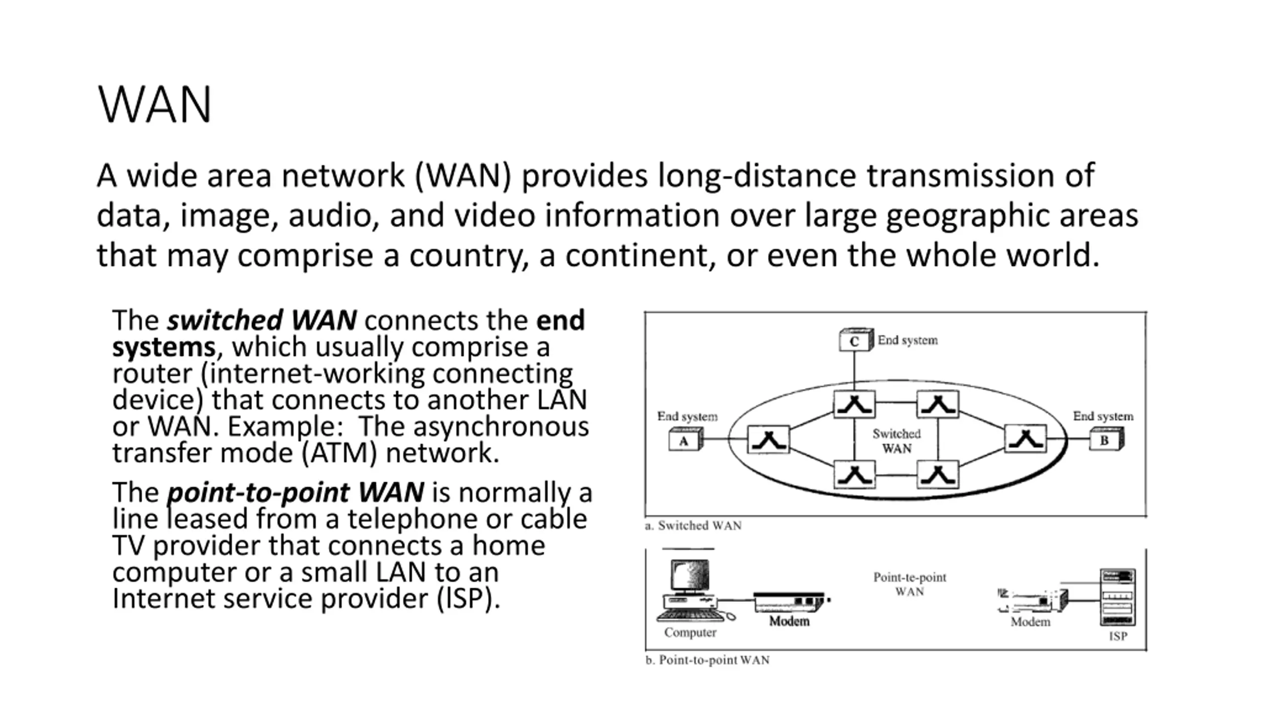 WAN A wide area network (WAN) provides long-distance transmission of data, image, audio, and video information over large geographic areas that may comprise a country, a continent, or even the whole world. The switched WAN connects the end systems, which usually comprise a router (internet-working connecting device) that connects to another LAN or WAN. Example: The asynchronous transfer mode (ATM) network. The point-to-point WAN is normally a line leased from a telephone or cable TV provider that connects a home computer or a small LAN to an Internet service provider (lSP).