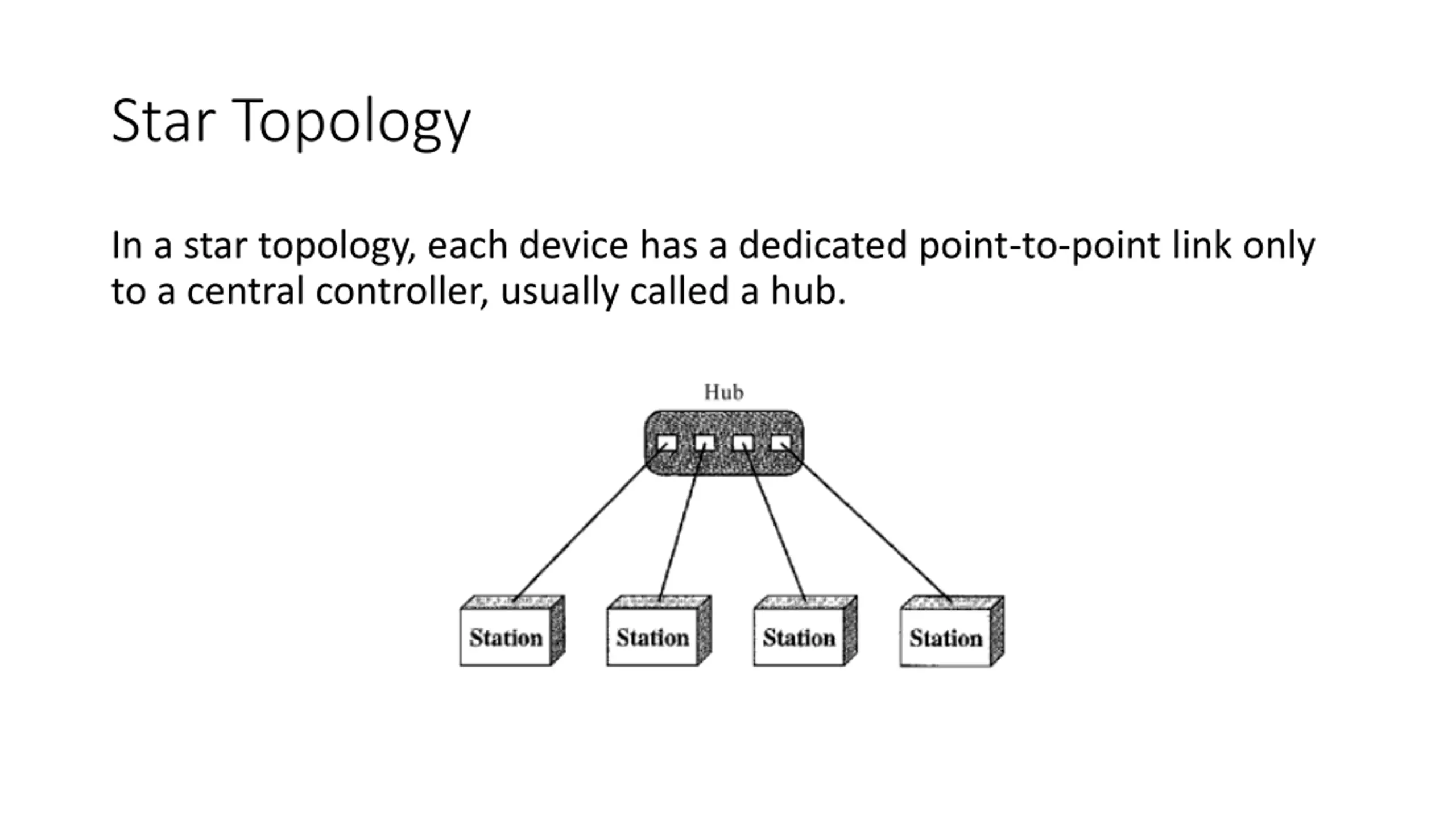 Star Topology In a star topology, each device has a dedicated point-to-point link only to a central controller, usually called a hub.
