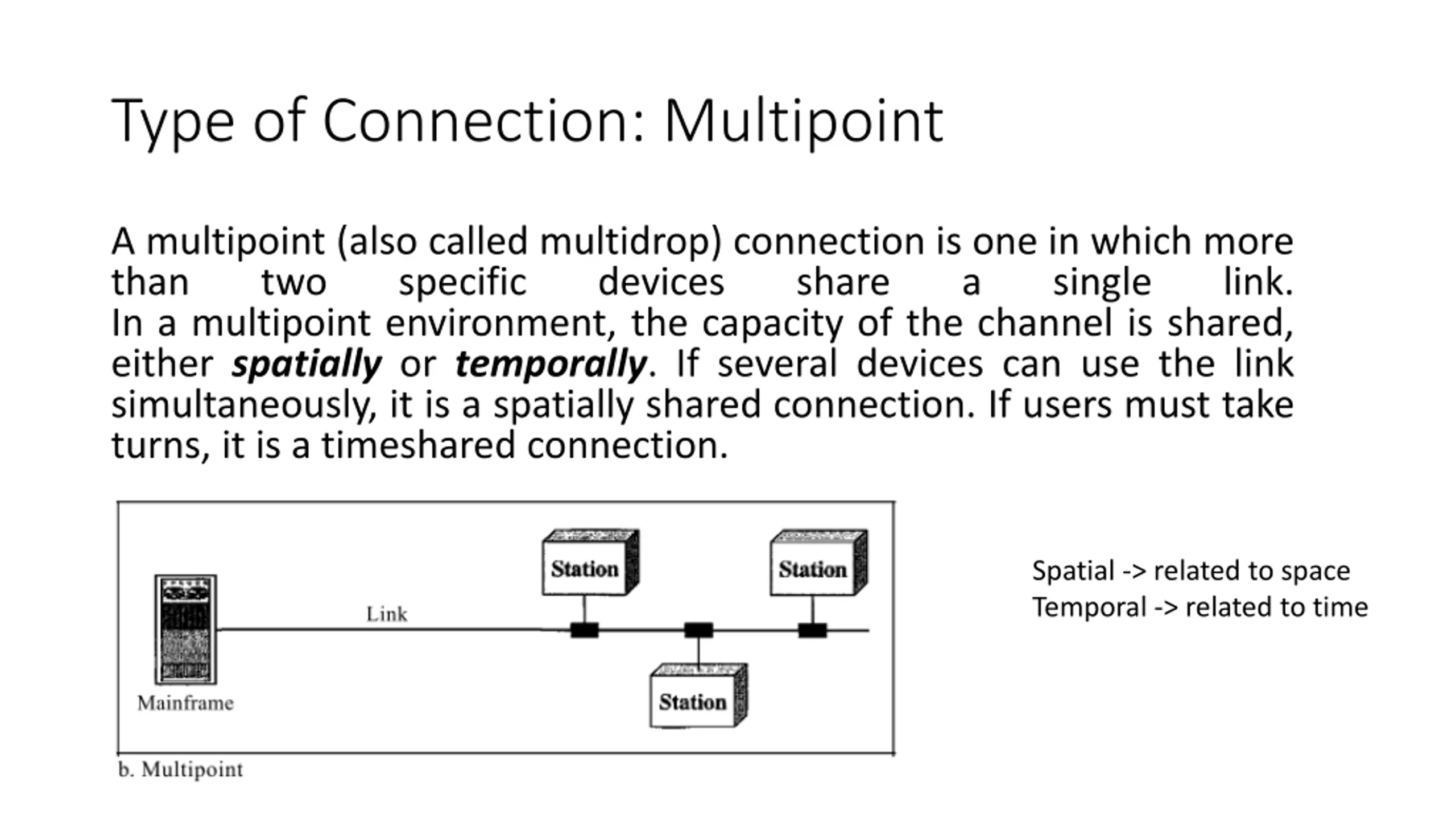 Type of Connection: Multipoint A multipoint (also called multidrop) connection is one in which more than two specific devices In a multipoint environment, the capacity of the channel is shared, either spatially or temporally. If several devices can use the link simultaneously, it is a spatially shared connection. If users must take turns, it is a timeshared connection. share a single link. Spatial -> related to space Temporal -> related to time