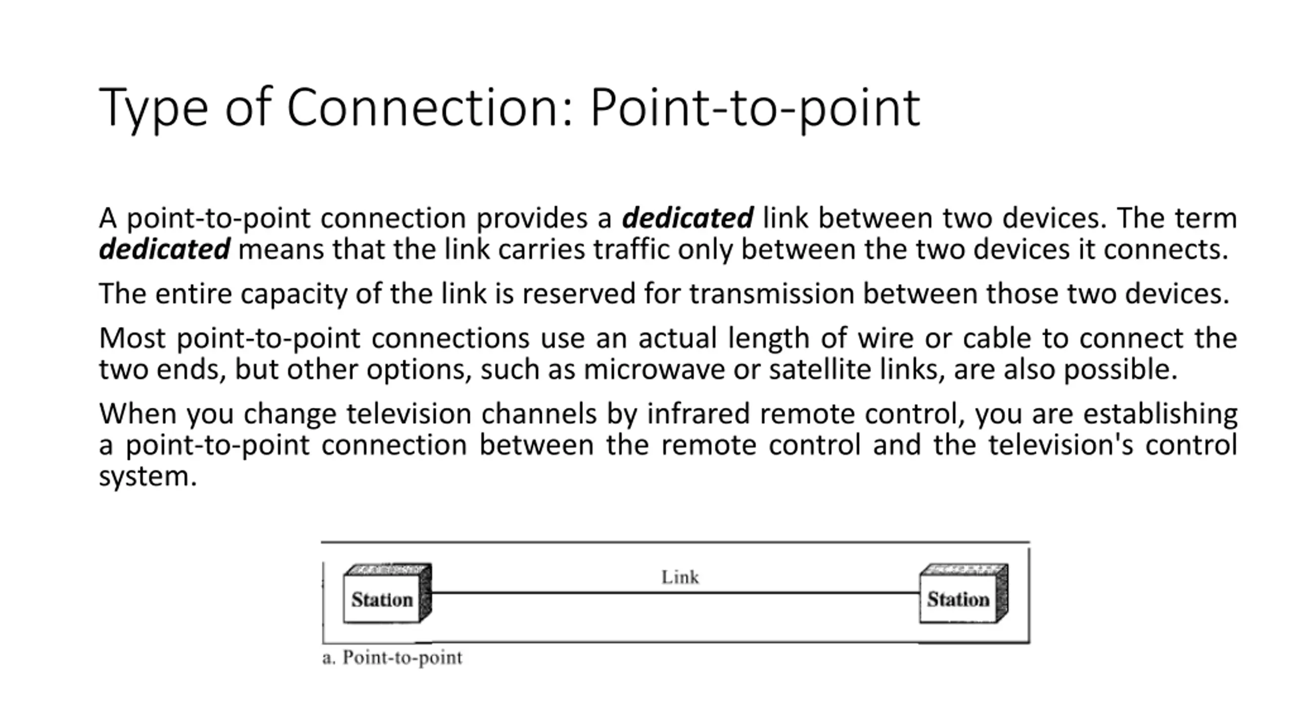 Type of Connection: Point-to-point A point-to-point connection provides a dedicated link between two devices. The term dedicated means that the link carries traffic only between the two devices it connects. The entire capacity of the link is reserved for transmission between those two devices. Most point-to-point connections use an actual length of wire or cable to connect the two ends, but other options, such as microwave or satellite links, are also possible. When you change television channels by infrared remote control, you are establishing a point-to-point connection between the remote control and the television's control system.