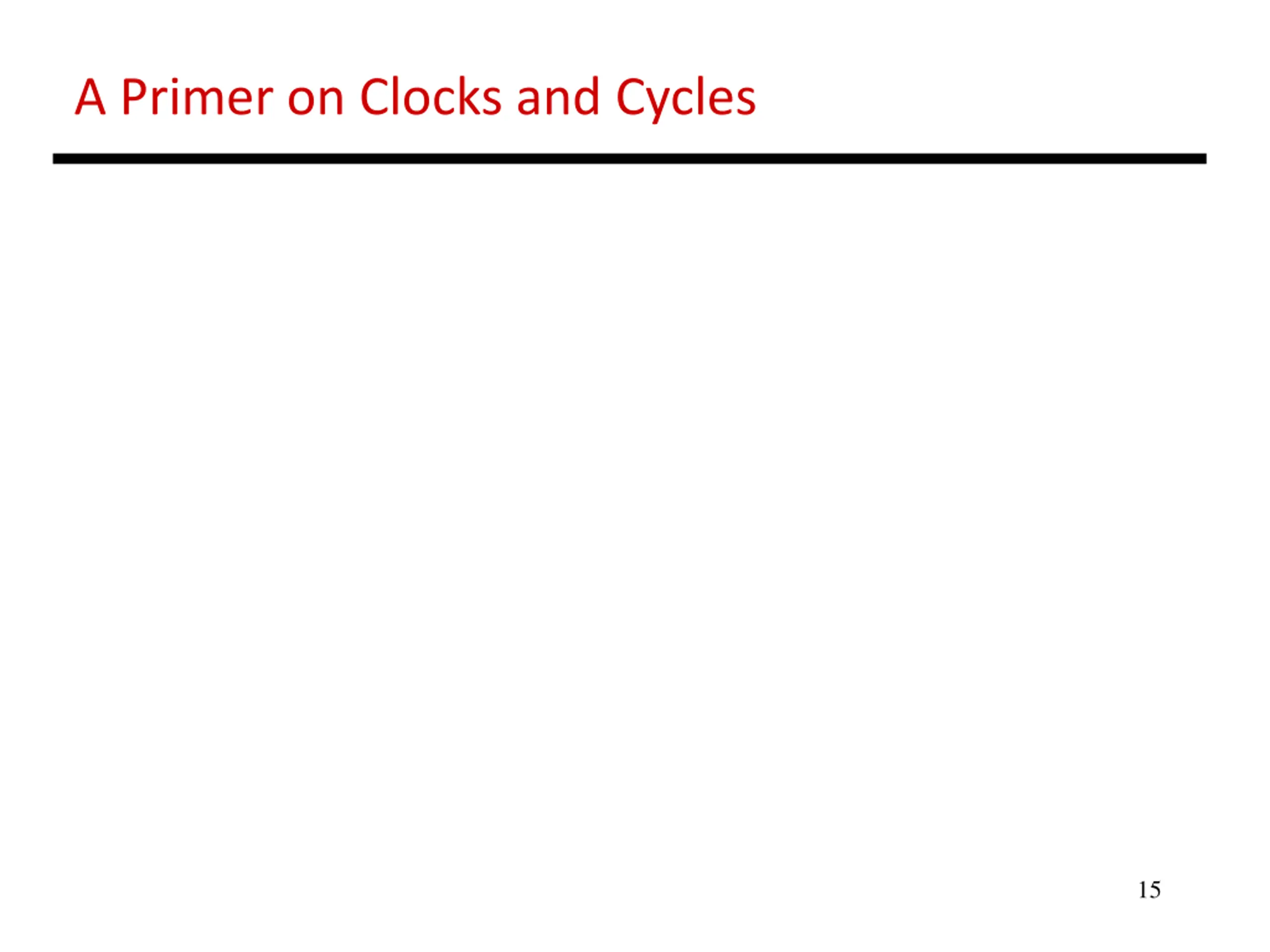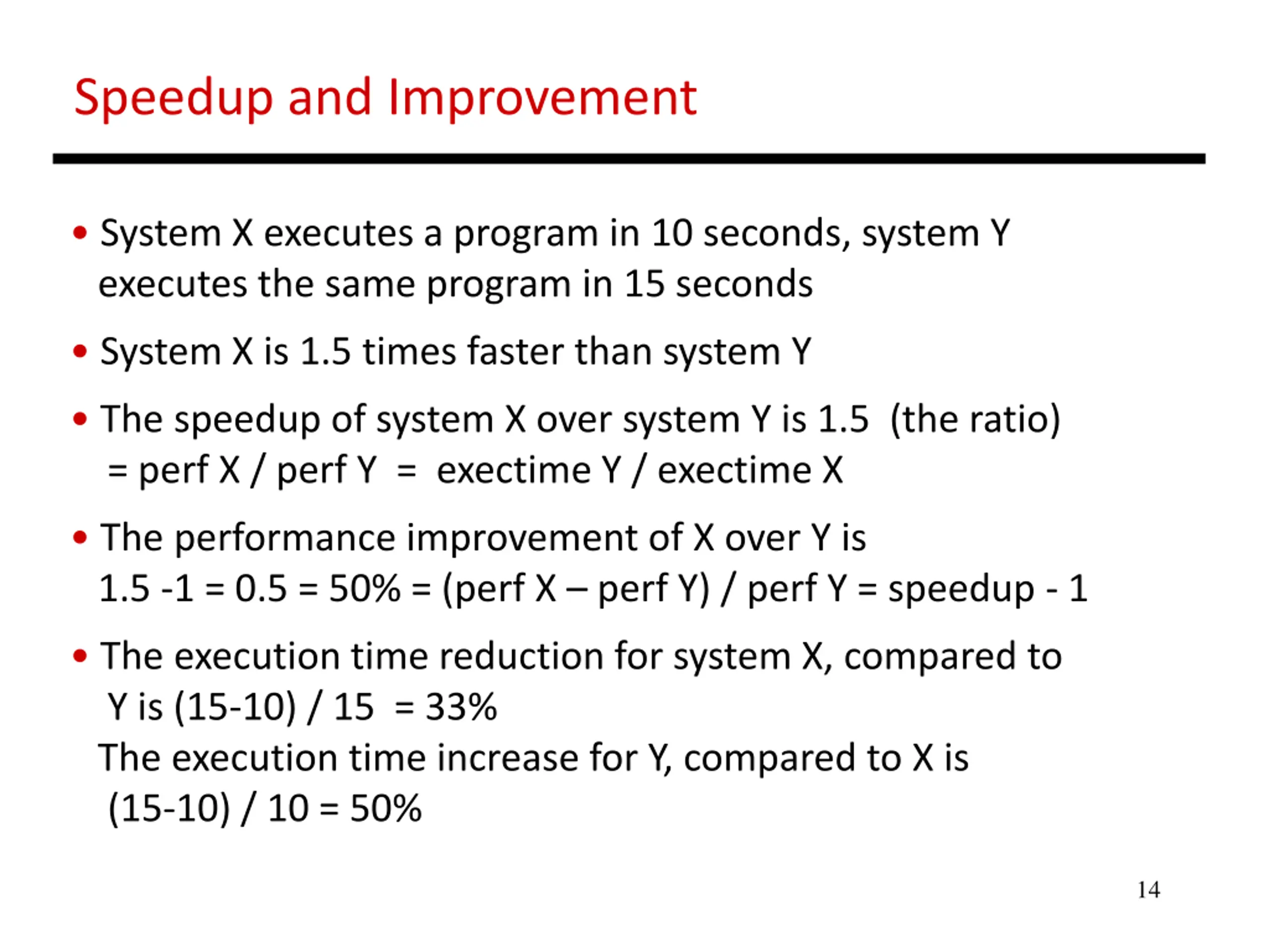 Speedup and Improvement System X executes a program in 10 seconds, system Y executes the same program in 15 seconds System X is 1.5 times faster than system Y The speedup of system X over system Y is 1.5 (the ratio) = perf X / perf Y = exectime Y / exectime X The performance improvement of X over Y is 1.5 -1 = 0.5 = 50% = (perf X perf Y) / perf Y = speedup - 1 The execution time reduction for system X, compared to Y is (15-10) / 15 = 33% The execution time increase for Y, compared to X is (15-10) / 10 = 50% 14
