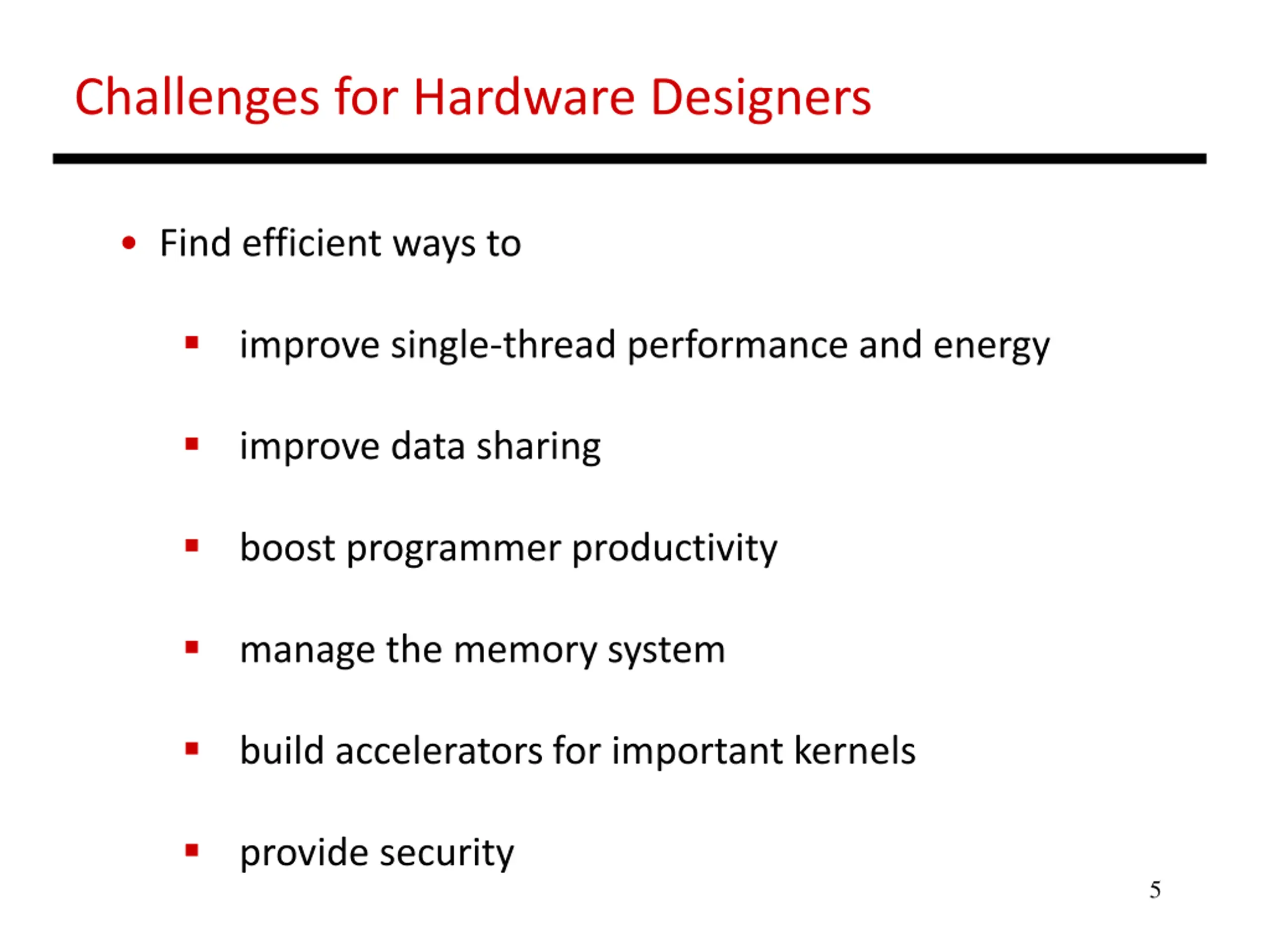Challenges for Hardware Designers Find efficient ways to improve single-thread performance and energy improve data sharing boost programmer productivity manage the memory system build accelerators for important kernels provide security 5