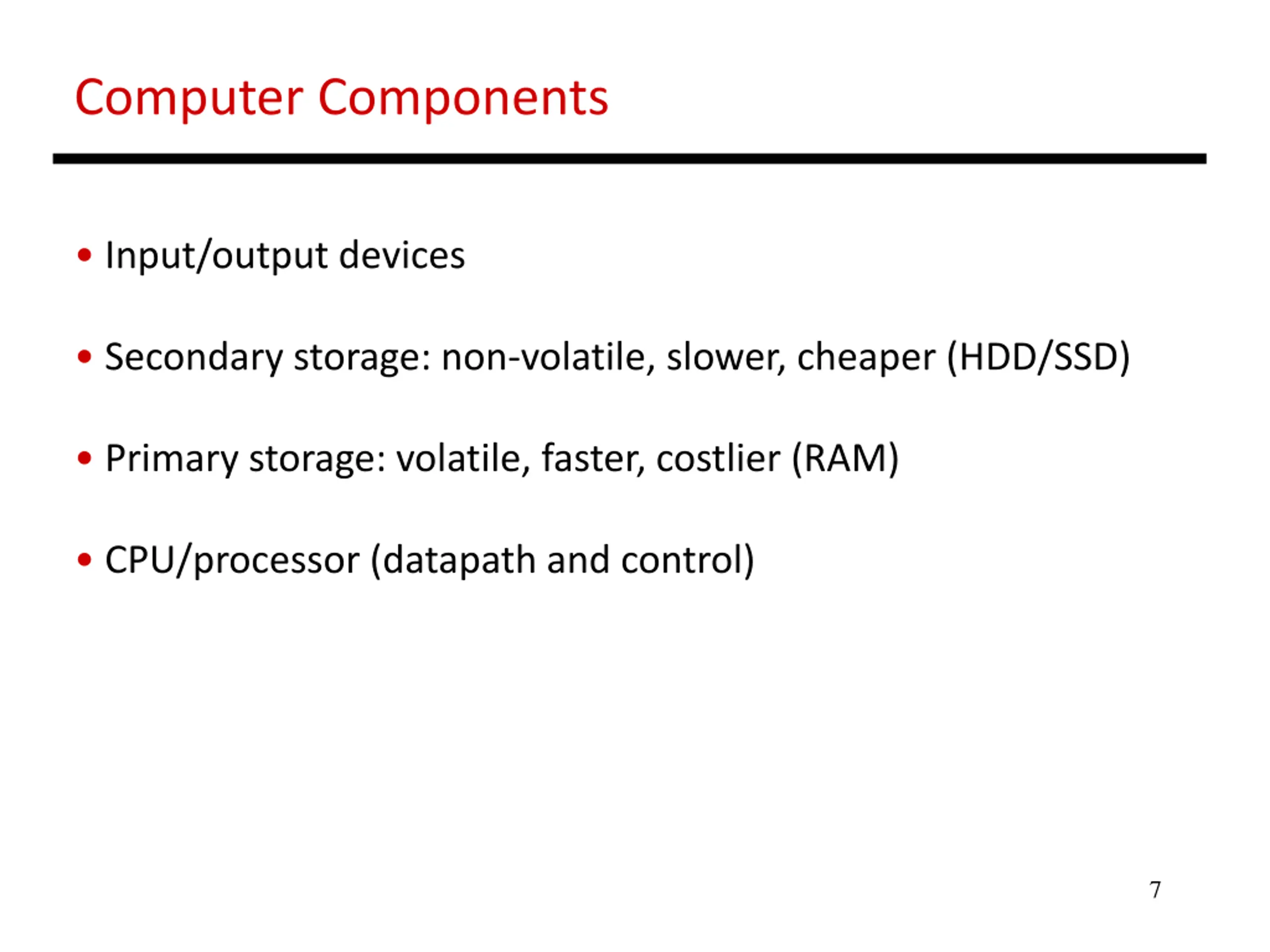 Computer Components Input/output devices Secondary storage: non-volatile, slower, cheaper (HDD/SSD) Primary storage: volatile, faster, costlier (RAM) CPU/processor (datapath and control) 7