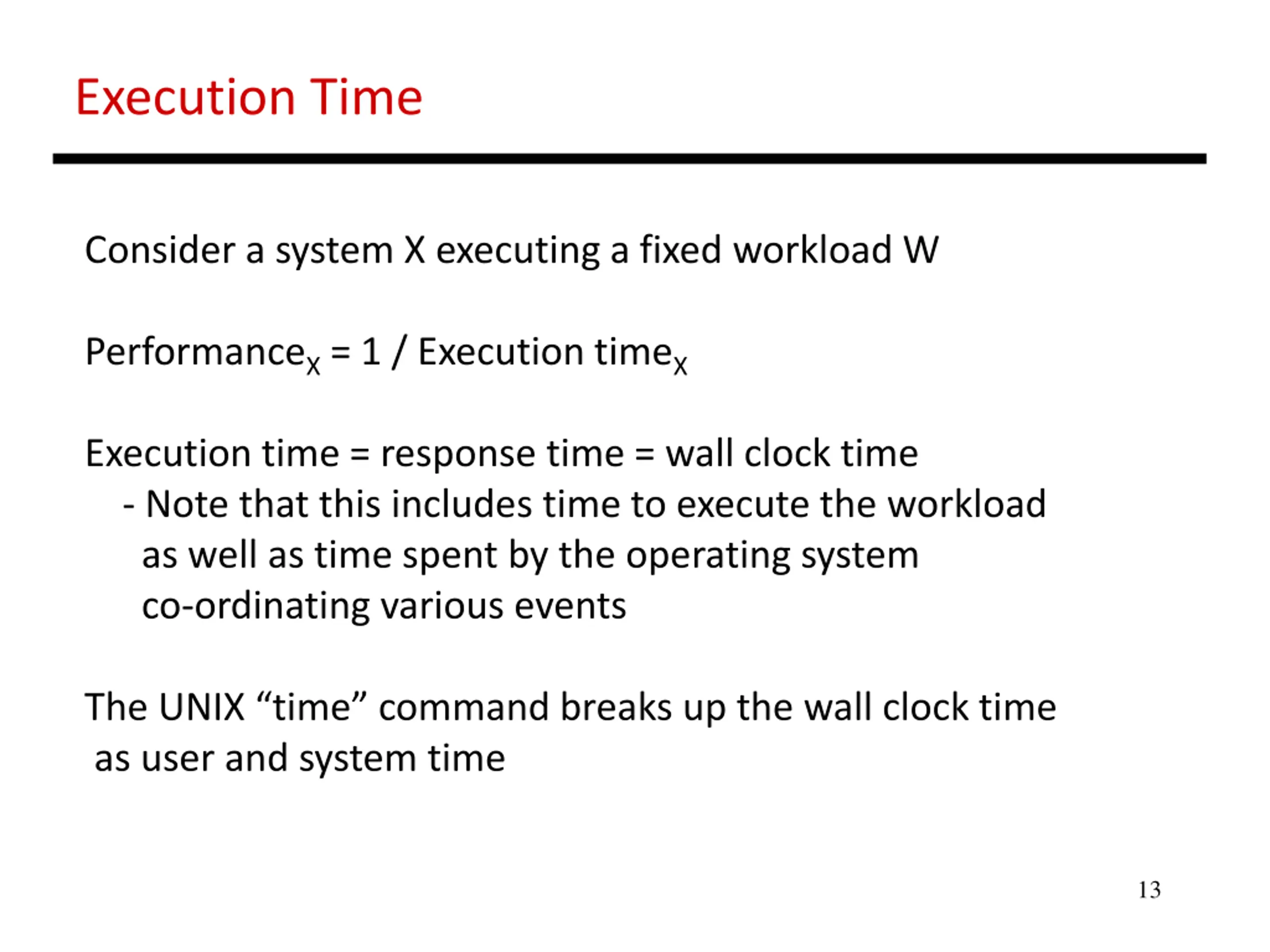 Execution Time Consider a system X executing a fixed workload W PerformanceX = 1 / Execution timeX Execution time = response time = wall clock time - Note that this includes time to execute the workload as well as time spent by the operating system co-ordinating various events The UNIX time command breaks up the wall clock time as user and system time 13