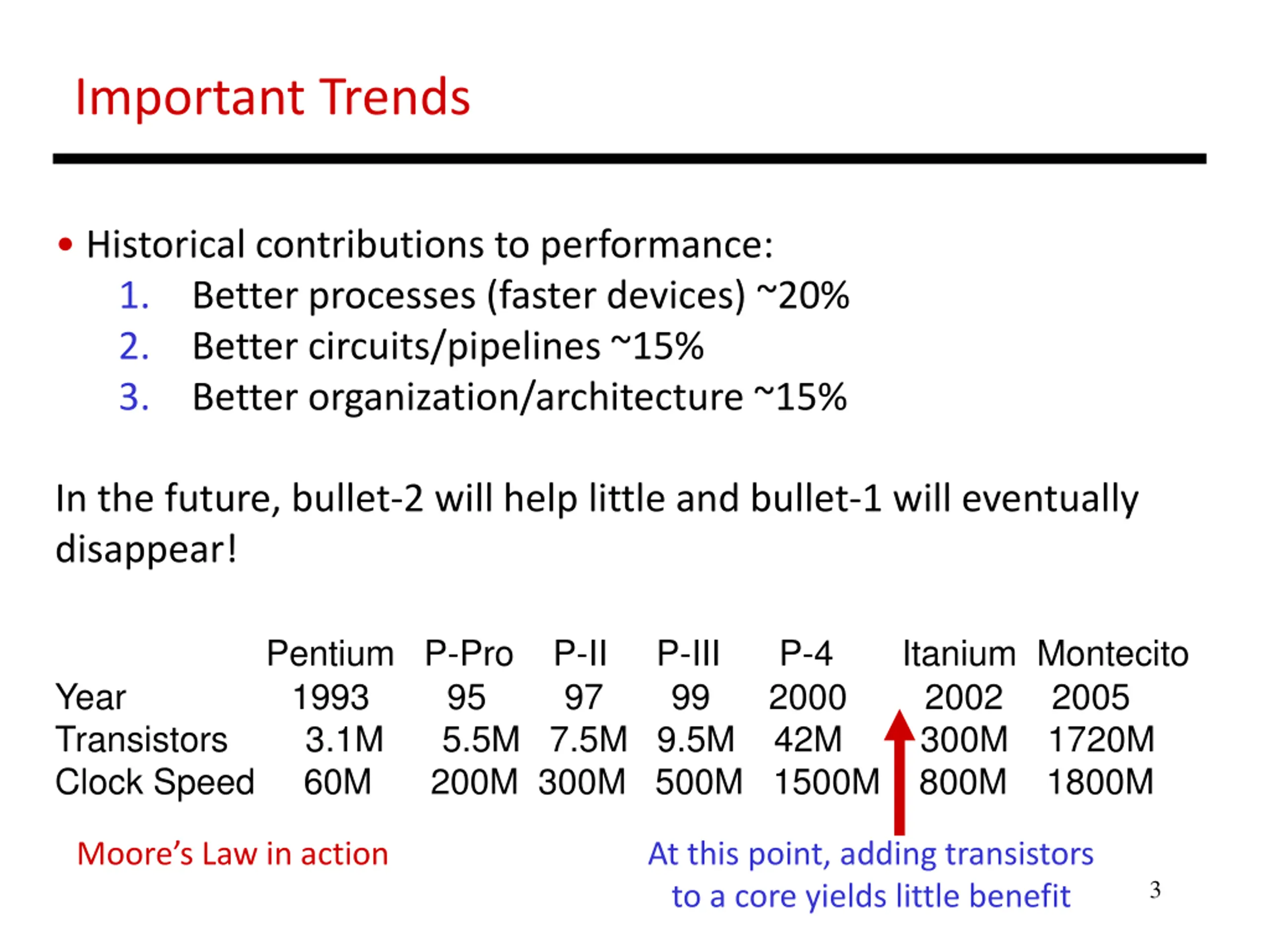 Important Trends Historical contributions to performance: 1. Better processes (faster devices) ~20% 2. Better circuits/pipelines ~15% 3. Better organization/architecture ~15% In the future, bullet-2 will help little and bullet-1 will eventually disappear! Pentium P-Pro P-II P-III P-4 Itanium Montecito Year 1993 95 97 99 2000 2002 2005 Transistors 3.1M 5.5M 7.5M 9.5M 42M 300M 1720M Clock Speed 60M 200M 300M 500M 1500M 800M 1800M Moore s Law in action At this point, adding transistors to a core yields little benefit 3