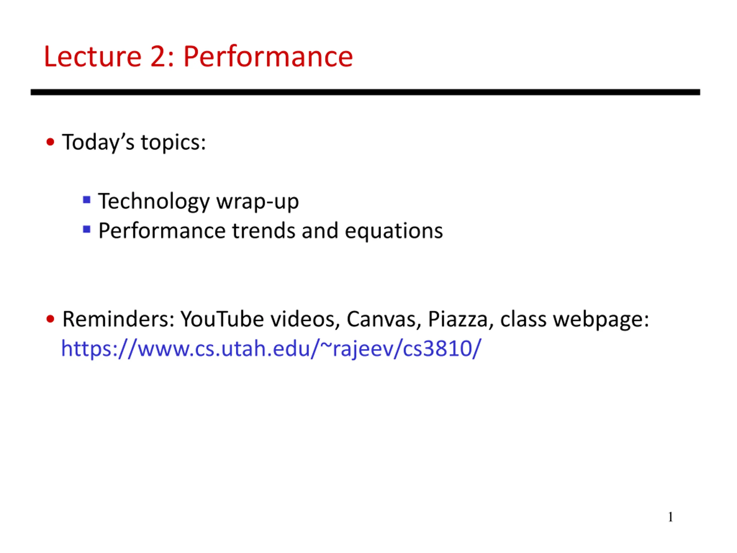 Lecture 2: Performance Today s topics: Technology wrap-up Performance trends and equations Reminders: YouTube videos, Canvas, Piazza, class webpage: https://www.cs.utah.edu/~rajeev/cs3810/ 1
