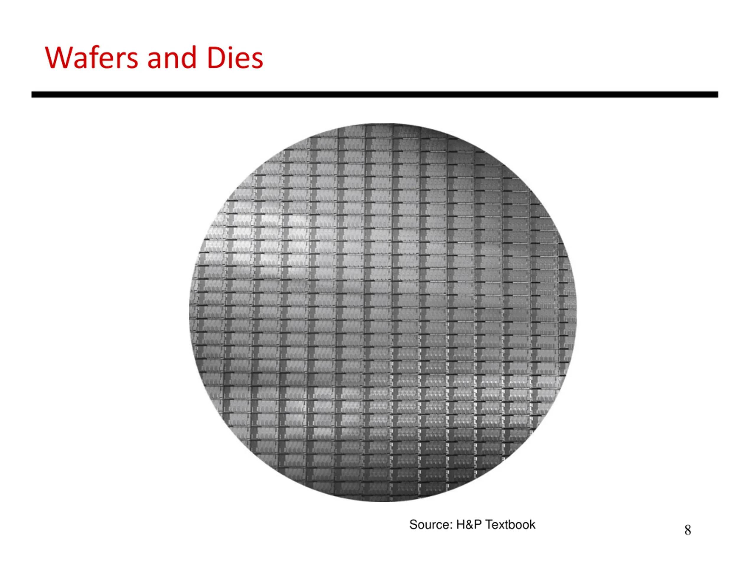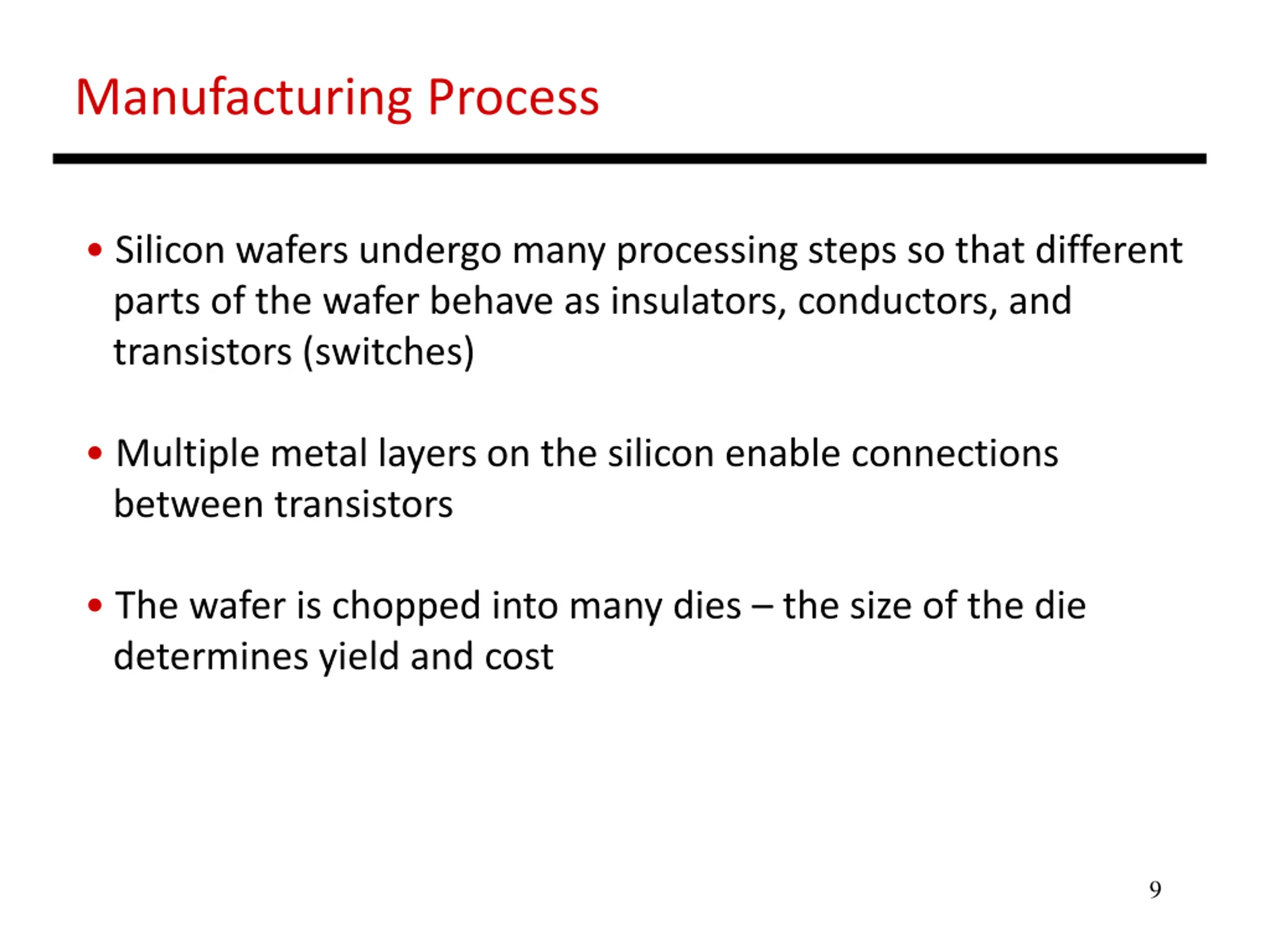 Manufacturing Process Silicon wafers undergo many processing steps so that different parts of the wafer behave as insulators, conductors, and transistors (switches) Multiple metal layers on the silicon enable connections between transistors The wafer is chopped into many dies the size of the die determines yield and cost 9