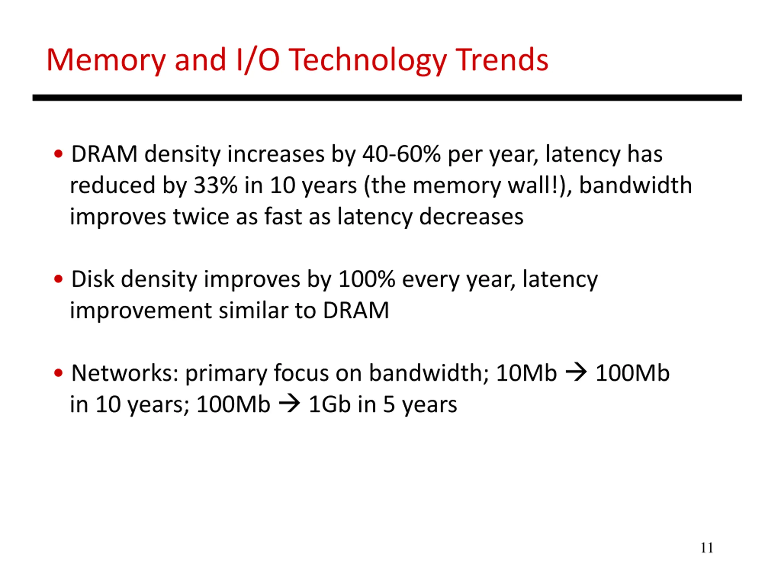 Memory and I/O Technology Trends DRAM density increases by 40-60% per year, latency has reduced by 33% in 10 years (the memory wall!), bandwidth improves twice as fast as latency decreases Disk density improves by 100% every year, latency improvement similar to DRAM Networks: primary focus on bandwidth; 10Mb 100Mb in 10 years; 100Mb 1Gb in 5 years 11