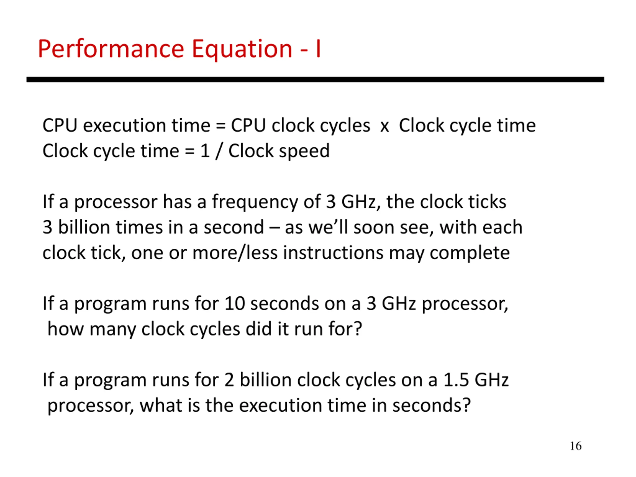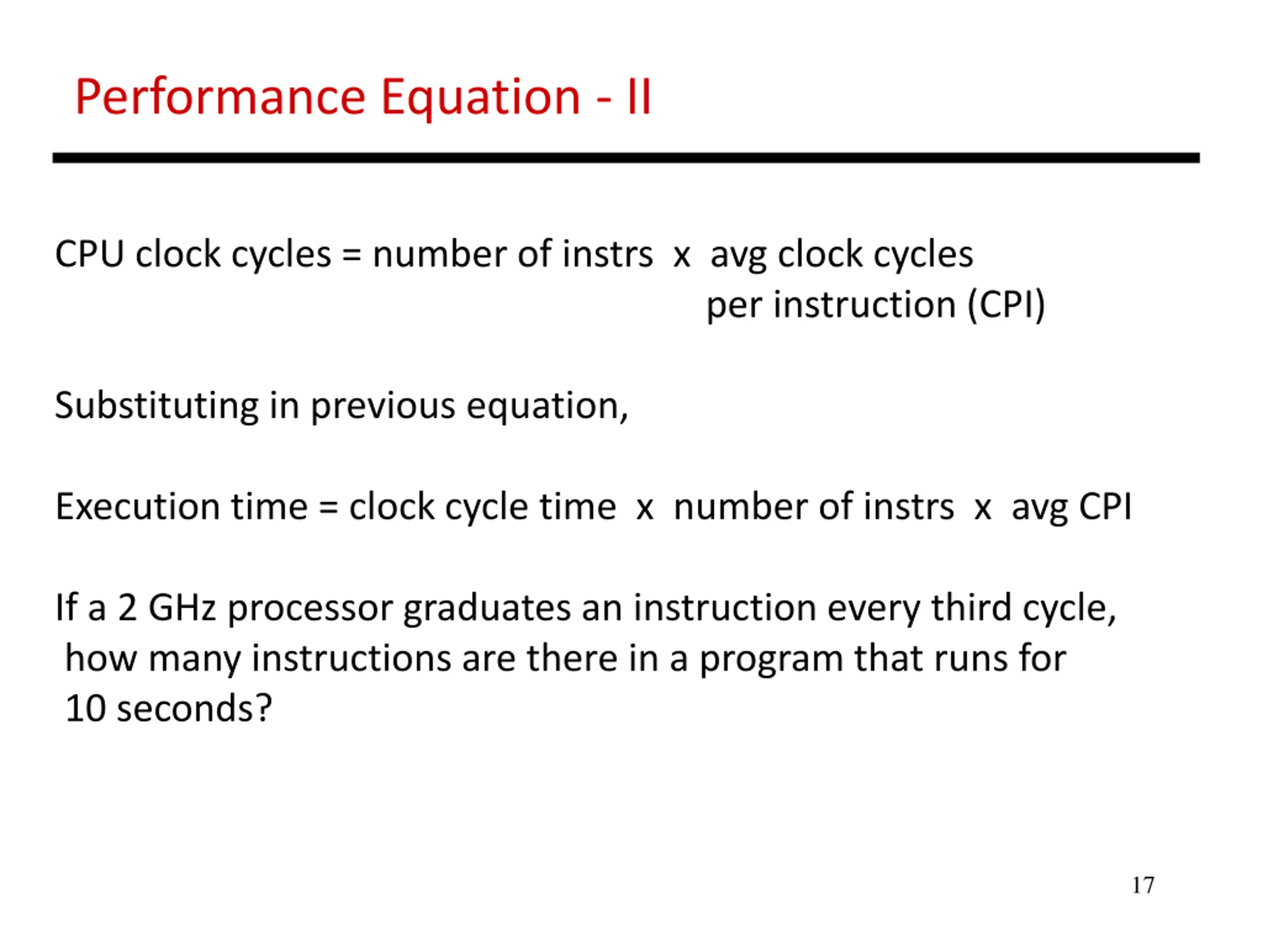 Performance Equation - I CPU execution time = CPU clock cycles x Clock cycle time Clock cycle time = 1 / Clock speed If a processor has a frequency of 3 GHz, the clock ticks 3 billion times in a second as we ll soon see, with each clock tick, one or more/less instructions may complete If a program runs for 10 seconds on a 3 GHz processor, how many clock cycles did it run for? If a program runs for 2 billion clock cycles on a 1.5 GHz processor, what is the execution time in seconds? 16