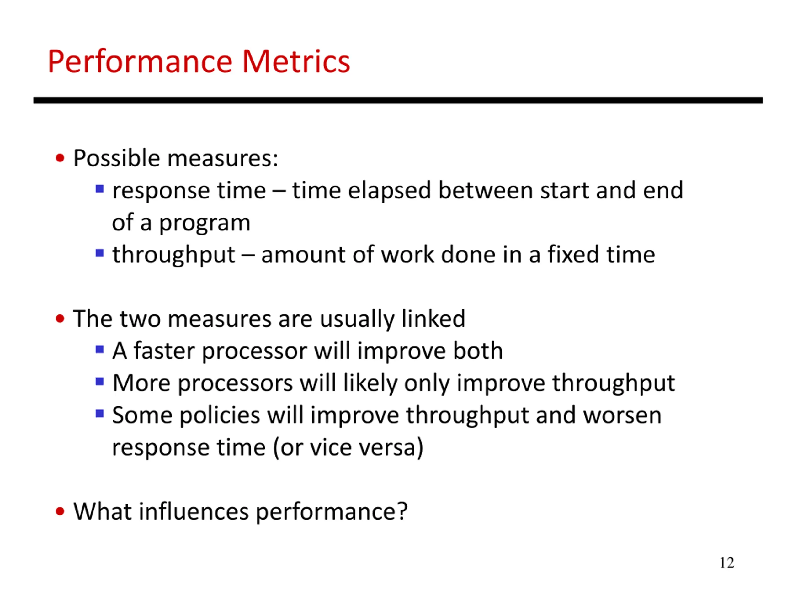Performance Metrics Possible measures: response time time elapsed between start and end of a program throughput amount of work done in a fixed time The two measures are usually linked A faster processor will improve both More processors will likely only improve throughput Some policies will improve throughput and worsen response time (or vice versa) What influences performance? 12