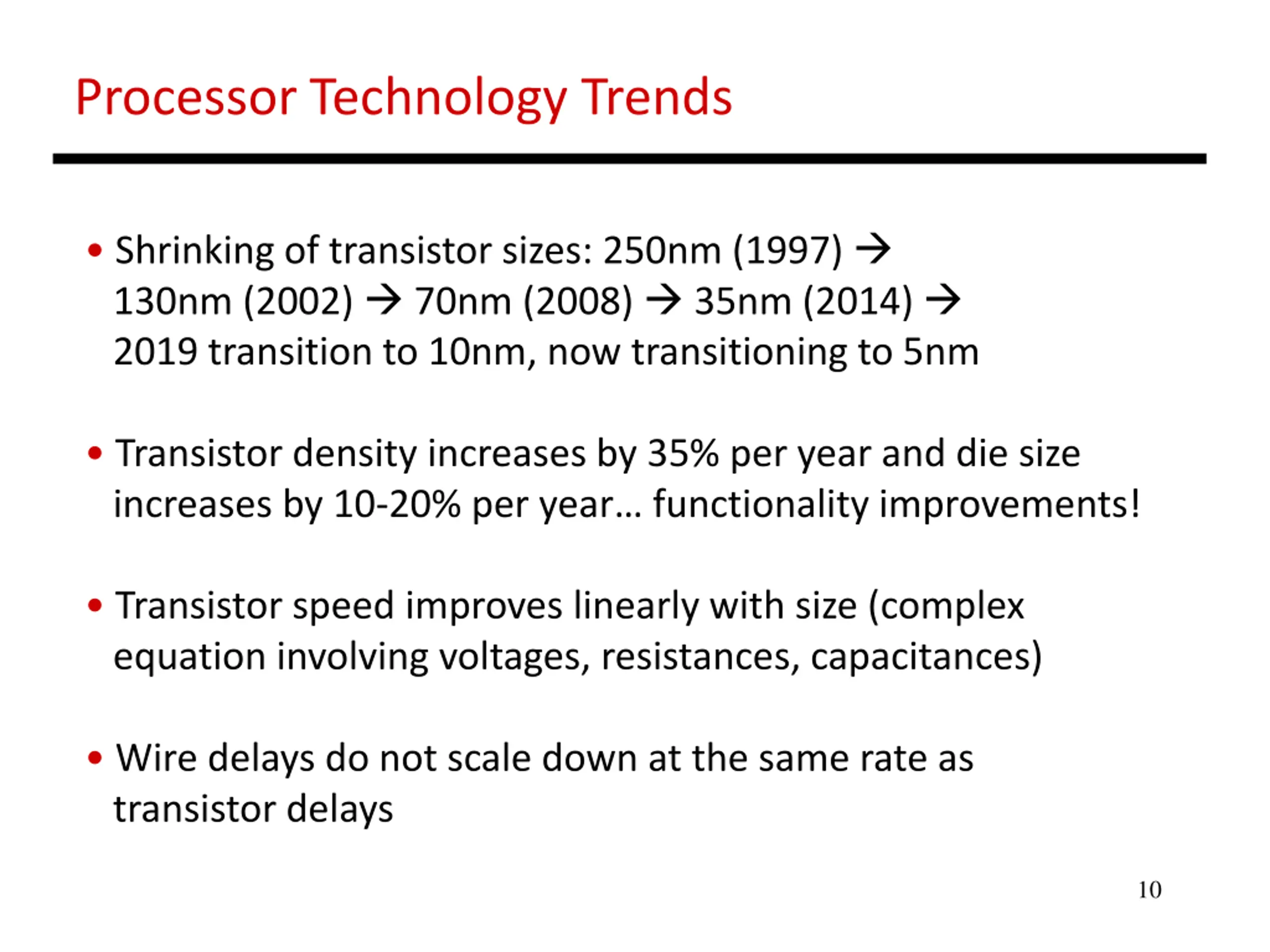 Processor Technology Trends Shrinking of transistor sizes: 250nm (1997) 130nm (2002) 70nm (2008) 35nm (2014) 2019 transition to 10nm, now transitioning to 5nm Transistor density increases by 35% per year and die size increases by 10-20% per year functionality improvements! Transistor speed improves linearly with size (complex equation involving voltages, resistances, capacitances) Wire delays do not scale down at the same rate as transistor delays 10