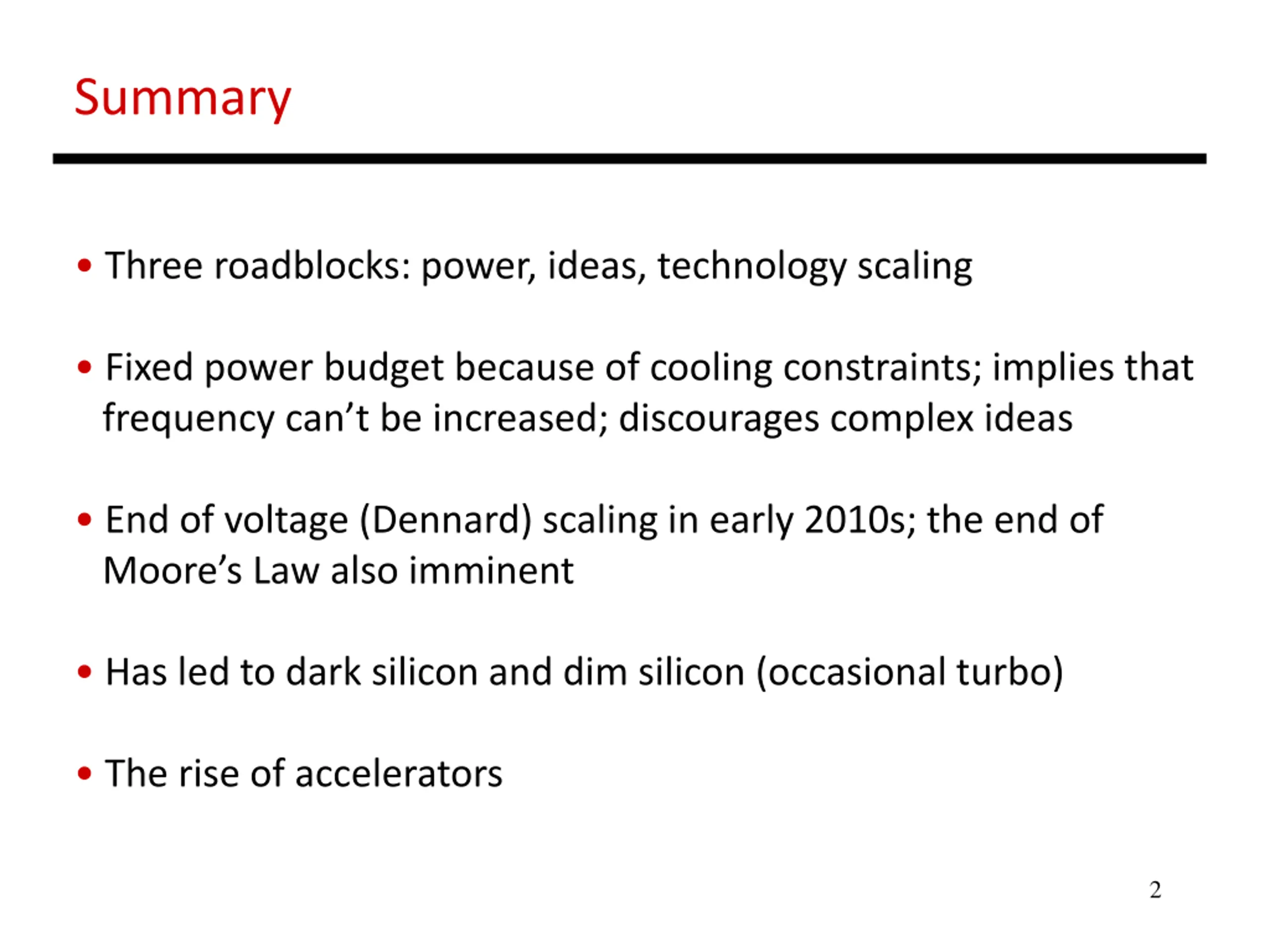 Summary Three roadblocks: power, ideas, technology scaling Fixed power budget because of cooling constraints; implies that frequency can t be increased; discourages complex ideas End of voltage (Dennard) scaling in early 2010s; the end of Moore s Law also imminent Has led to dark silicon and dim silicon (occasional turbo) The rise of accelerators 2