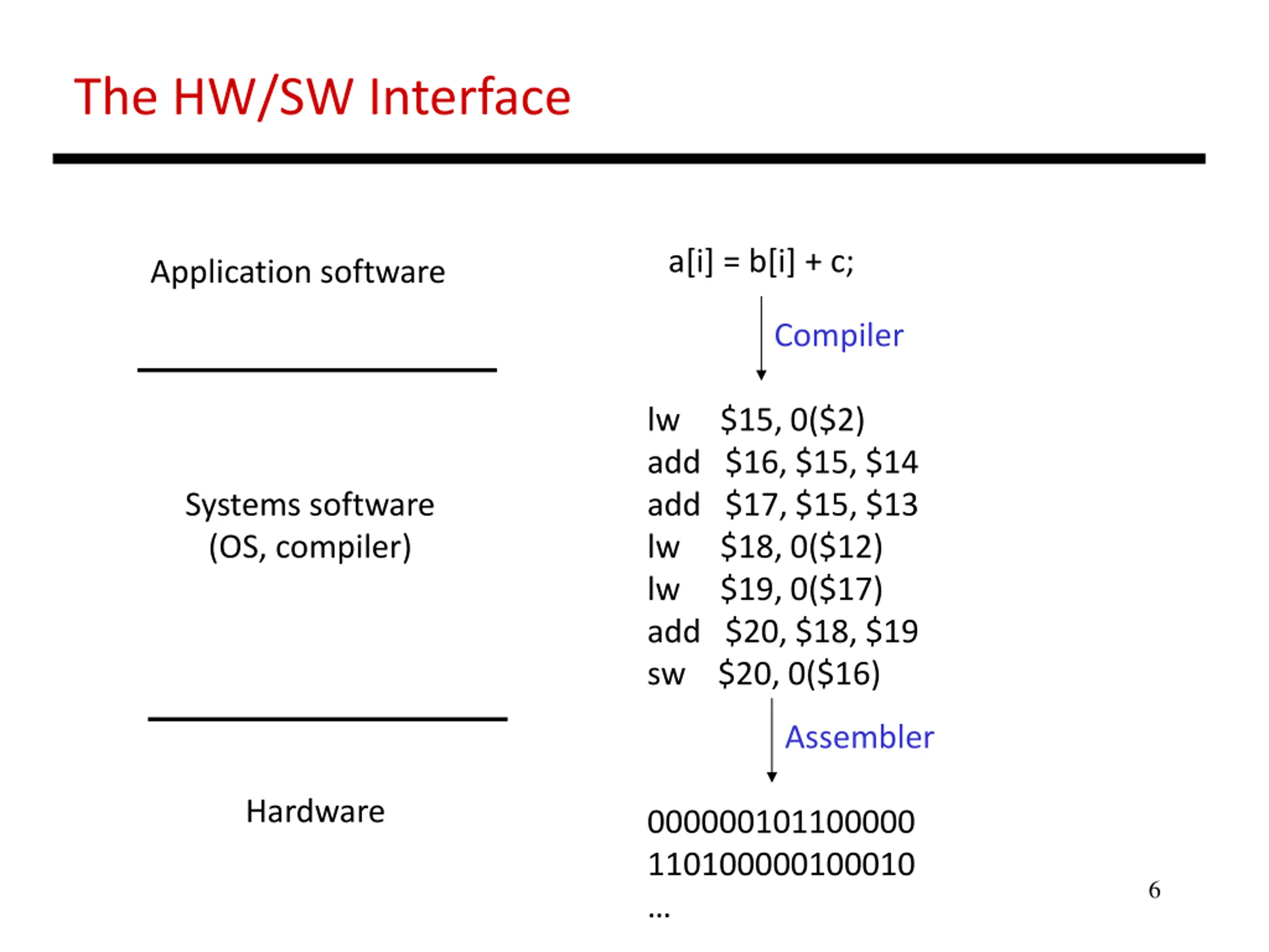 The HW/SW Interface a[i] = b[i] + c; Application software Compiler lw $15, 0($2) add $16, $15, $14 add $17, $15, $13 lw $18, 0($12) lw $19, 0($17) add $20, $18, $19 sw $20, 0($16) Systems software (OS, compiler) Assembler Hardware 000000101100000 110100000100010 6