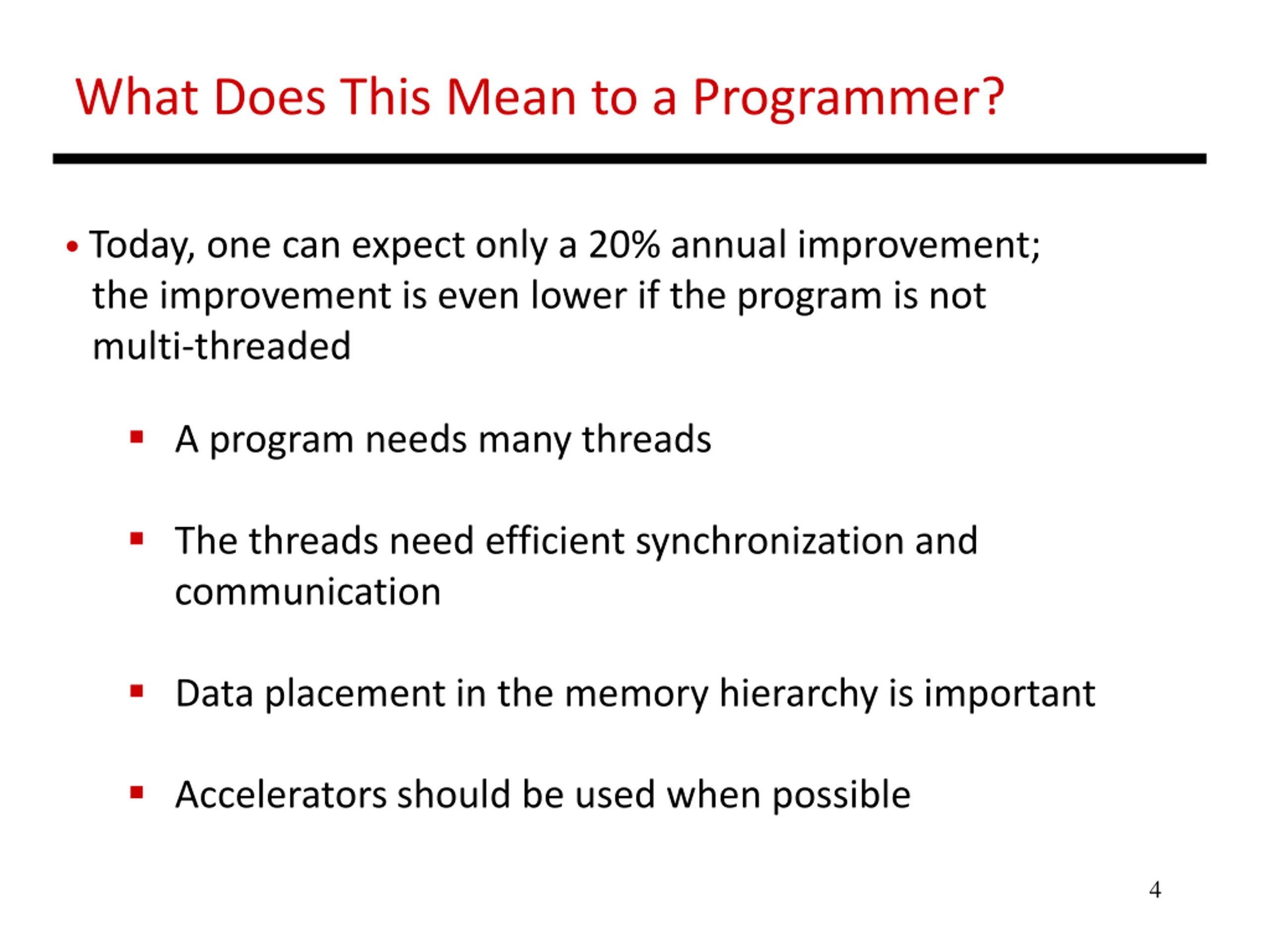 What Does This Mean to a Programmer? Today, one can expect only a 20% annual improvement; the improvement is even lower if the program is not multi-threaded A program needs many threads The threads need efficient synchronization and communication Data placement in the memory hierarchy is important Accelerators should be used when possible 4
