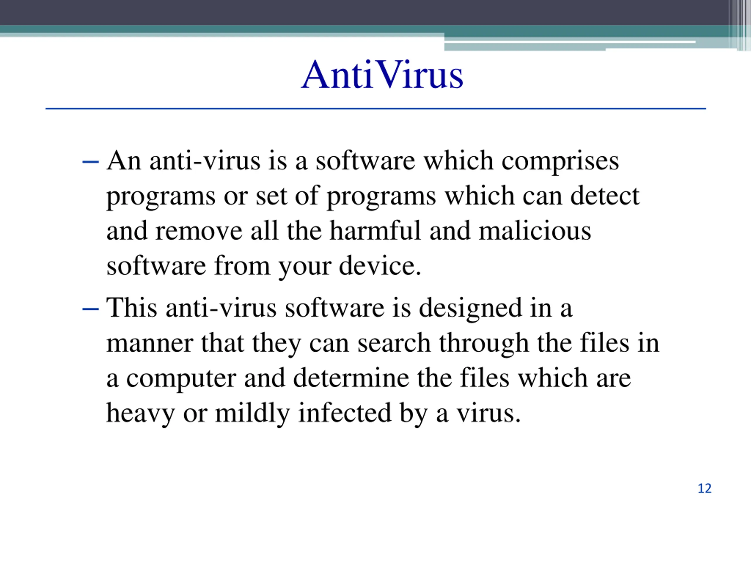 AntiVirus An anti-virus is a software which comprises programs or set of programs which can detect and remove all the harmful and malicious software from your device. This anti-virus software is designed in a manner that they can search through the files in a computer and determine the files which are heavy or mildly infected by a virus. 12